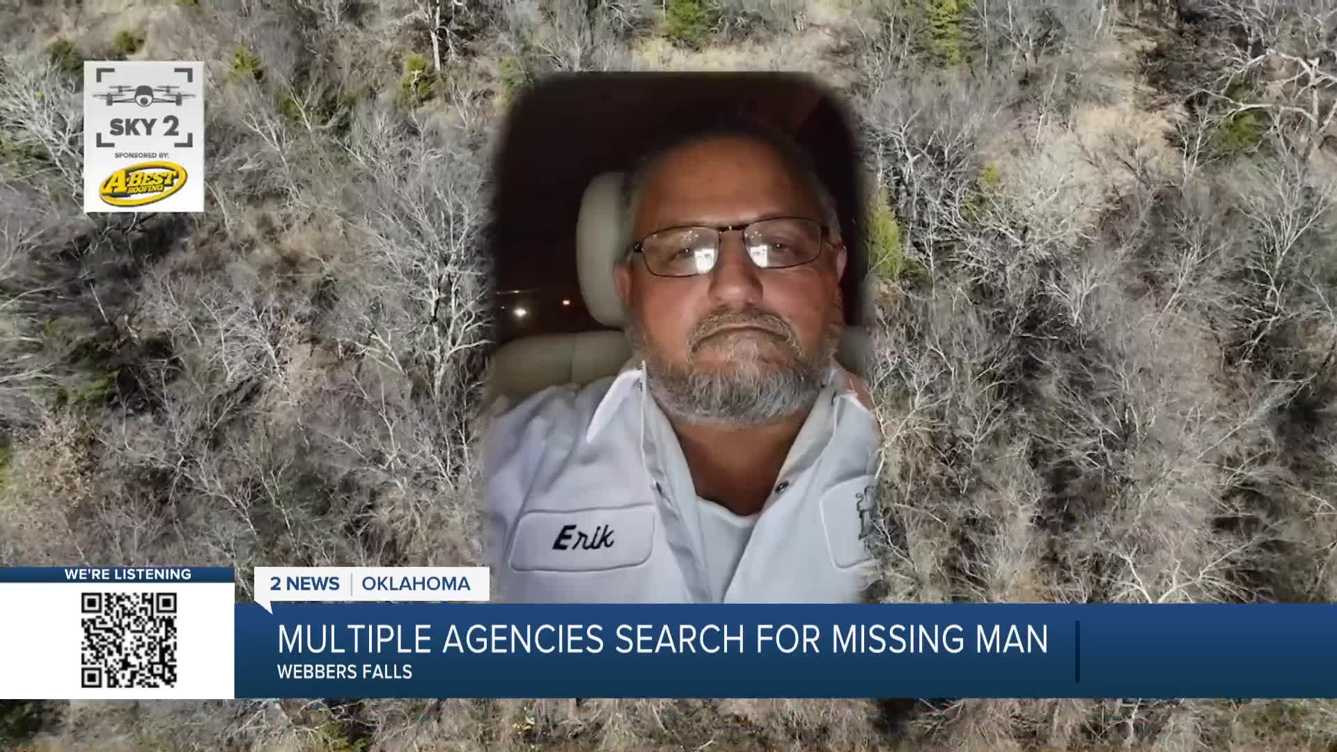 WEBBERS FALLS, Okla. — A small church parking lot outside Webbers Falls was filled with first responders and area search-and-rescue teams. All of them are searching for 56-year-old Erik Throne.