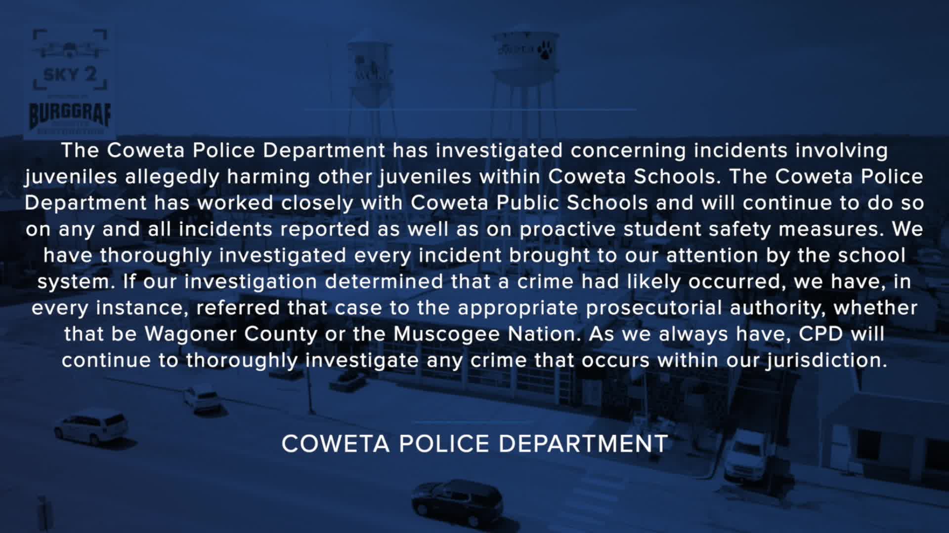 "The Coweta Police Department has investigated concerning incidents involving juveniles allegedly harming other juveniles within Coweta Schools. The Coweta Police Department has worked closely with Coweta Public Schools and will continue to do so on any and all incidents reported as well as on proactive student safety measures. We have thoroughly investigated every incident brought to our attention by the school system. If our investigation determined that a crime had likely occurred, we have, in every instance, referred that case to the appropriate prosecutorial authority, whether that be Wagoner County or the Muscogee Nation. As we always have, CPD will continue to thoroughly investigate any crime that occurs within our jurisdiction."