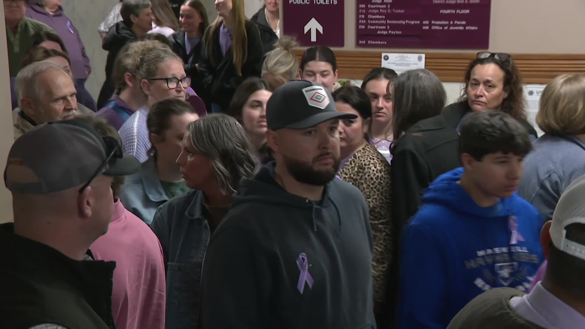 Friends, family, and supporters of the Clay family packed the courtroom, all donning purple.