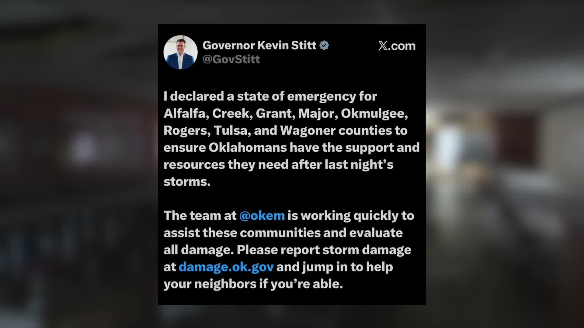 On Mar 7, Governor Kevin Stitt declared a state of emergency for several Oklahoma counties, including Okmulgee County. He said the declaration will ensure communities have access to state resources and support as they recover from the tornado damage.