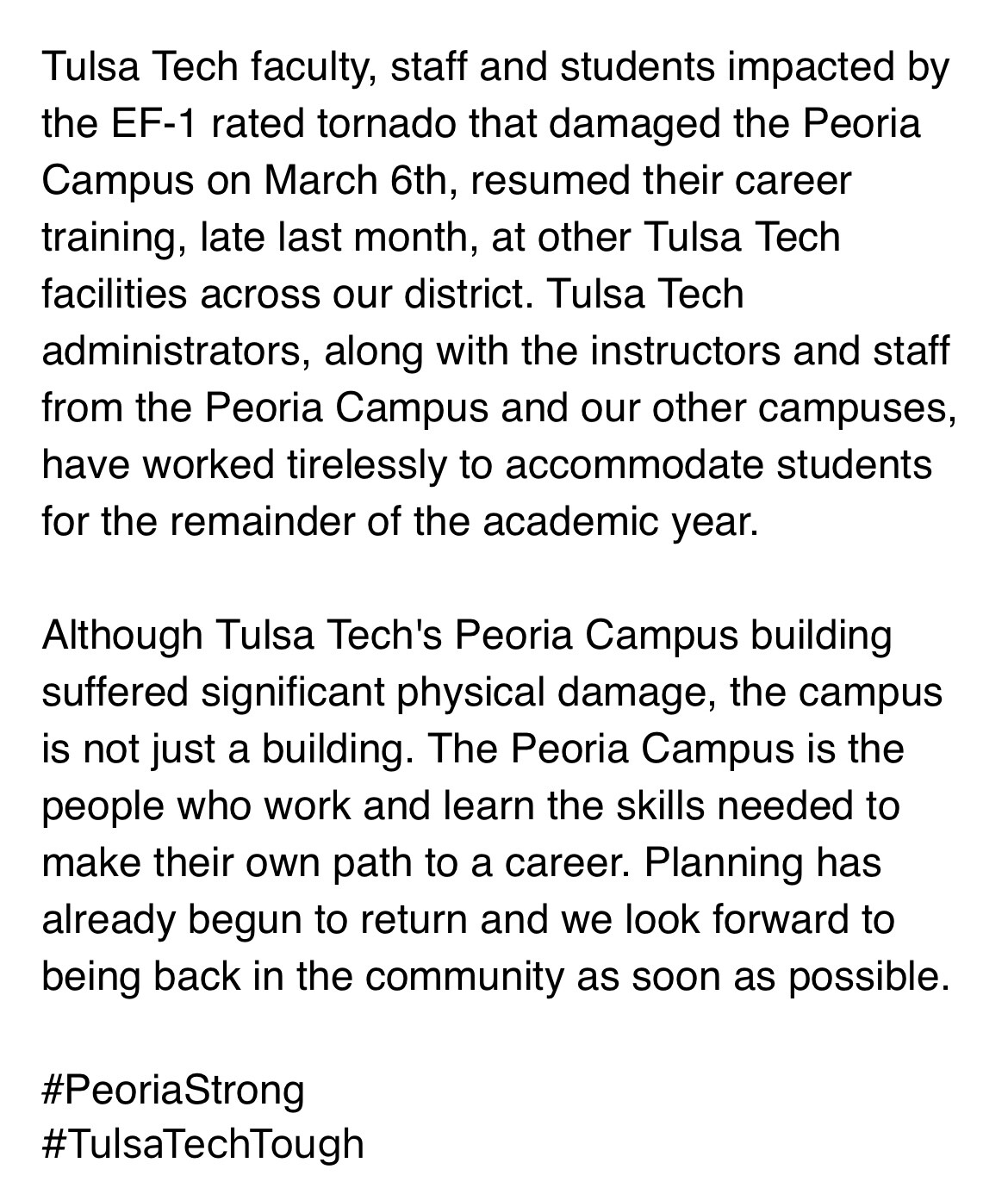 It reads Tulsa Tech administrators along with instructors and staff from all campuses have worked tirelessly to accommodate students for the remainder of the year.