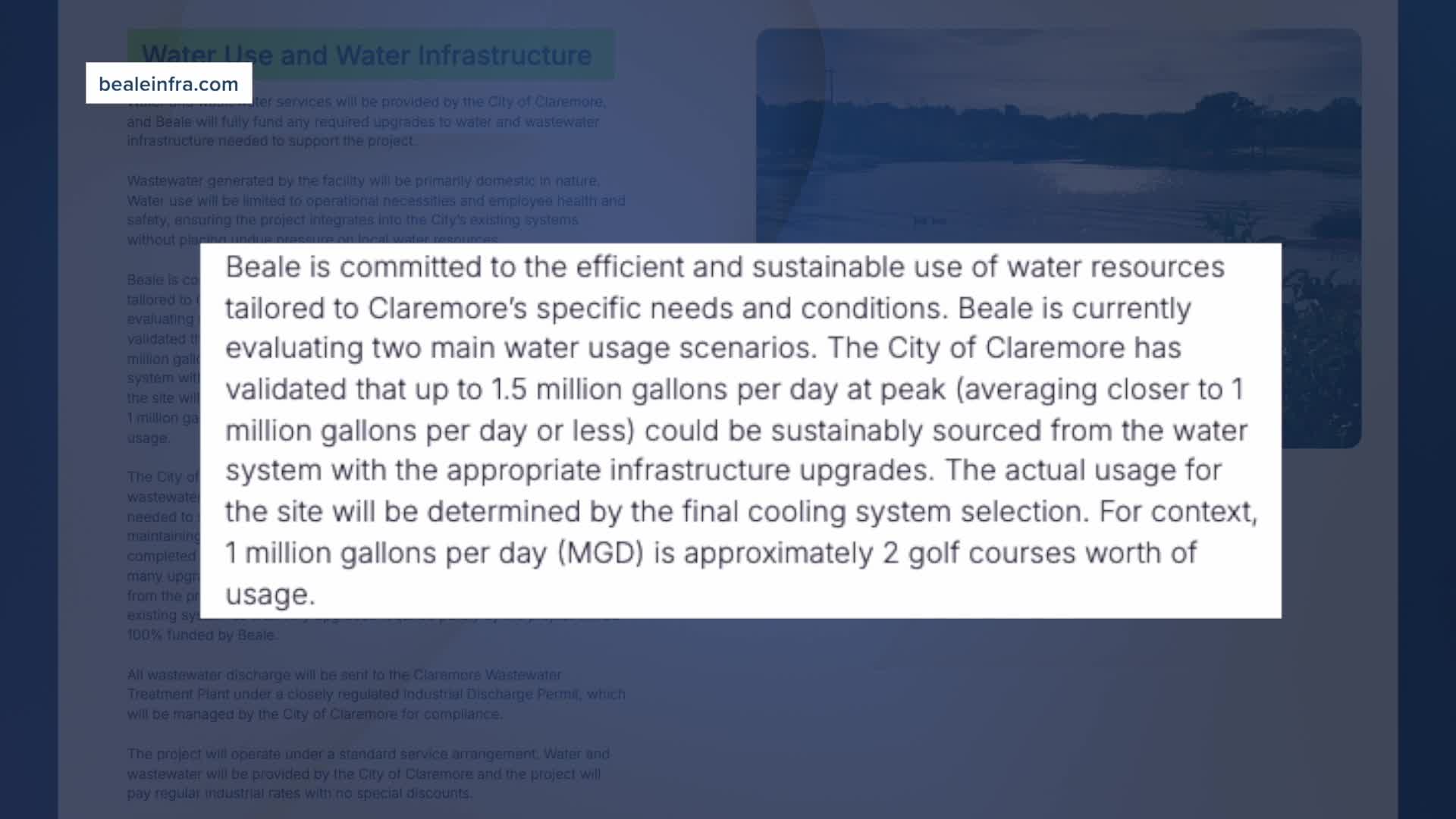 “Beale is currently evaluating two main water usage scenarios. The City of Claremore has validated that up to 1.5 million gallons per day at peak (averaging closer to 1 million gallons per day or less) could be sustainably sourced from the water system with the appropriate infrastructure upgrades. The actual usage for the site will be determined by the final cooling system selection.”