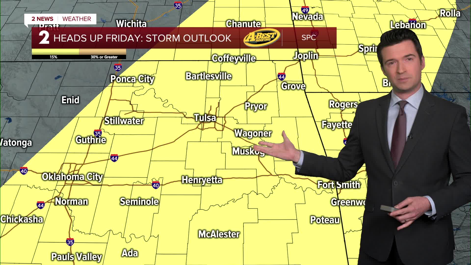 TULSA, Okla. — We'll have mostly cloudy skies tonight with a chance for some showers and t-storms crossing the area. The low in Tulsa down to 43° behind a cold front. North winds 10-15 mph with gusts 20-25 mph.