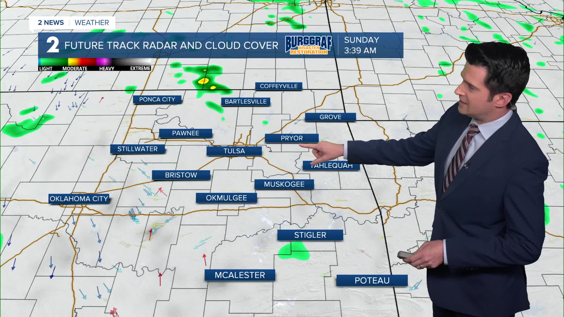 TULSA, OKLA. — We'll see scattered rain showers with maybe an isolated thunderstorm tonight. The low down to 56°. Winds east 5-15 mph.