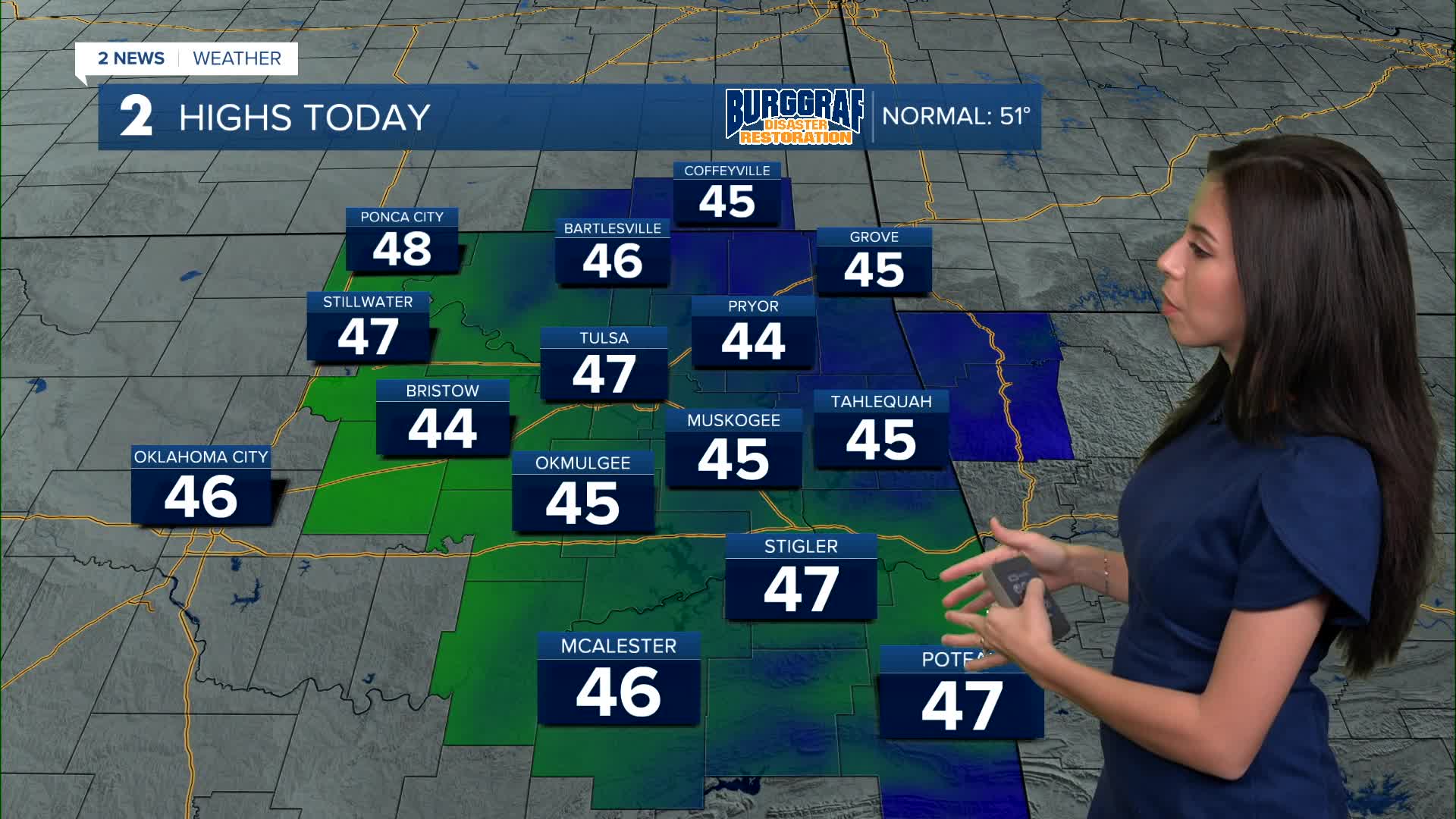 TULSA, Okla. — Bundle up once again this Monday morning with temperatures in the 20s. Afternoon highs in the upper 40s with partly cloudy skies and south winds 10-25 mph.