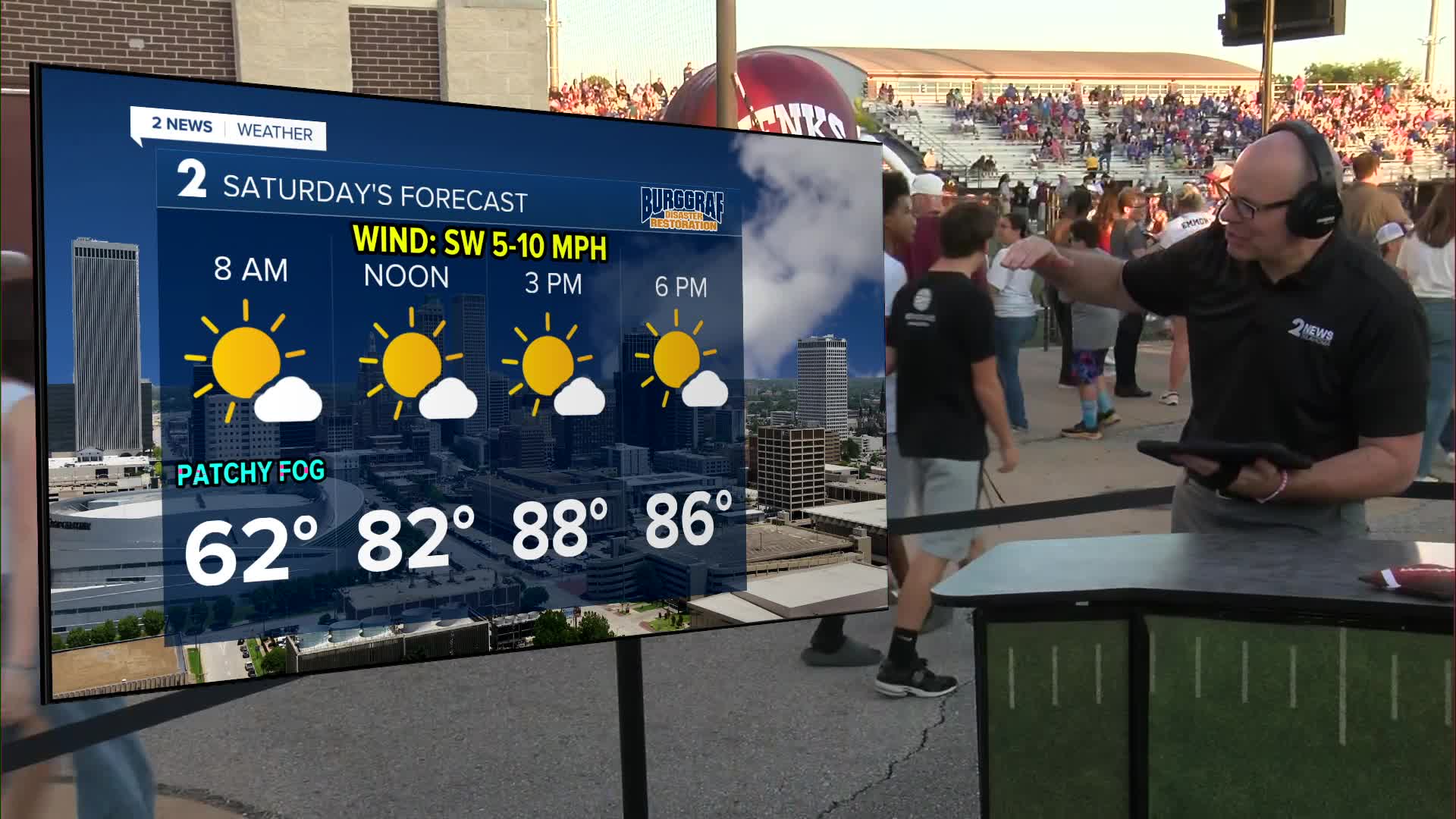 TULSA, OKLA. — Some patchy fog is possible once again early tomorrow morning. Dry weather is expected for the upcoming weekend with temperatures warming in the mid to upper 80s for both Saturday and Sunday. Morning lows near 60°.