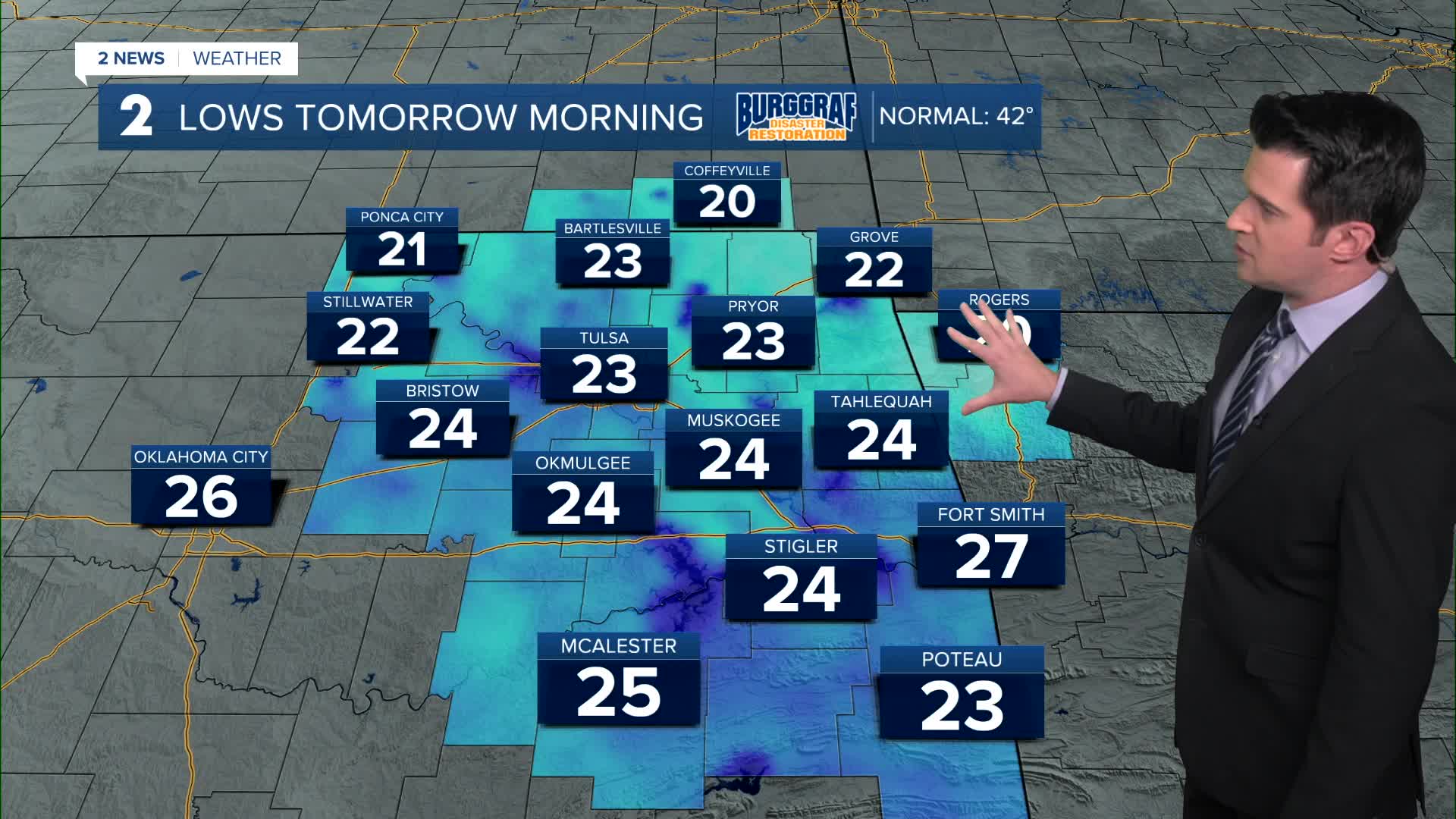 We'll see clear skies tonight with lows down to the 20s. Wind chills by Monday morning in the teens to the low 20s. Going for 23° in Tulsa. North winds 5-10 mph.