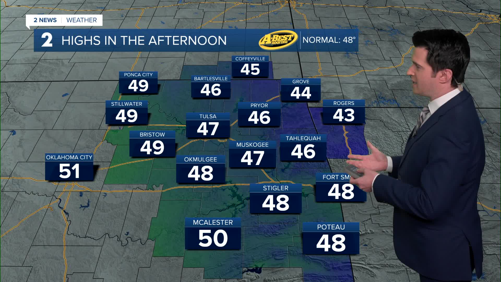 TULSA, OKLA. — We'll have clear skies tonight with the low in Tulsa down to 29°. W/NW winds 5-15 mph.
