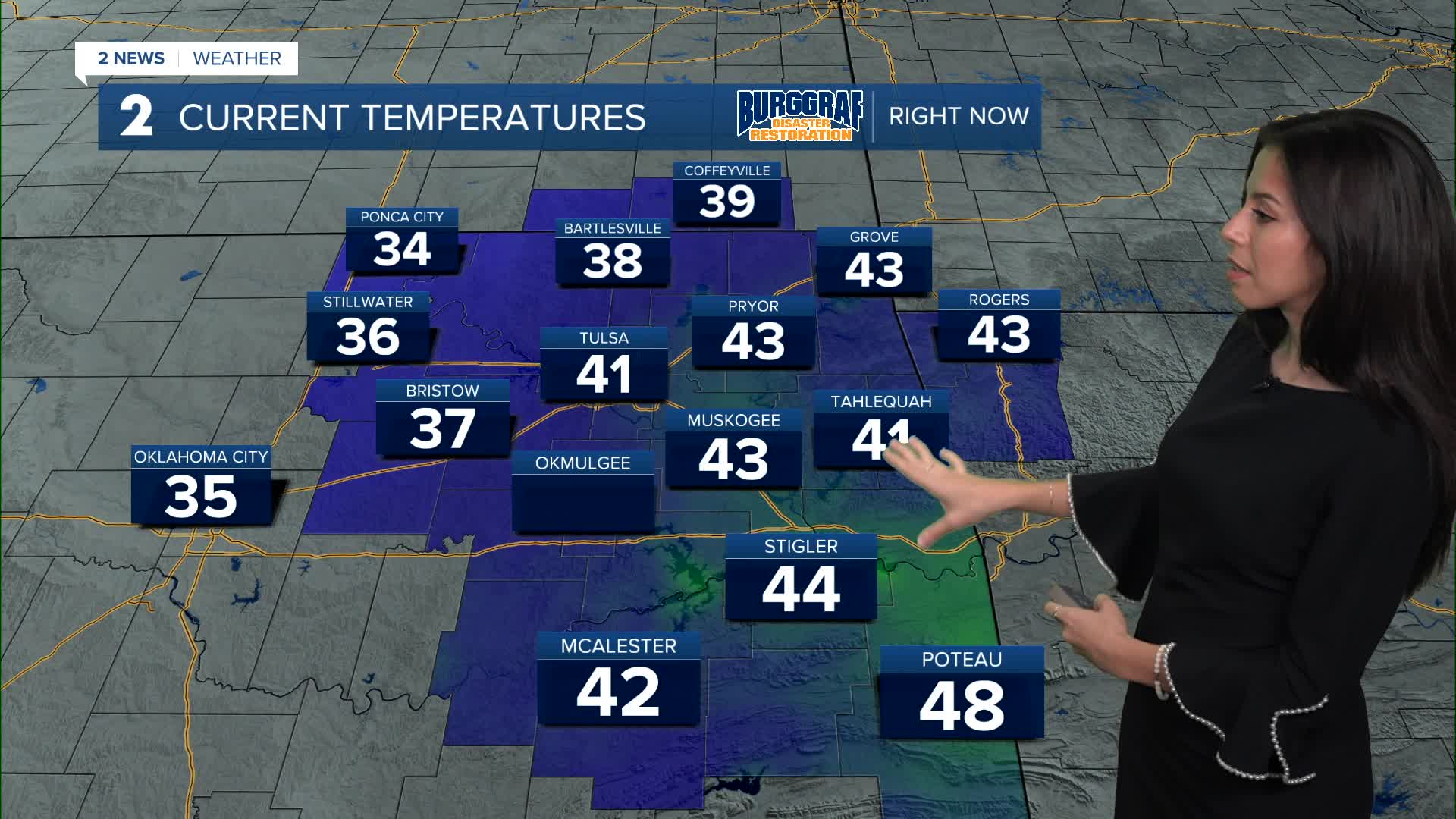 On Halloween Friday, a Frost Advisory may be needed for parts of Green Country to start with morning lows in the mid/upper 30s. The afternoon looks beautiful with highs in the mid 60s. We'll fall into the mid/upper 50s for trick-or-treating Friday evening. A nice evening with increasing cloud coverage.