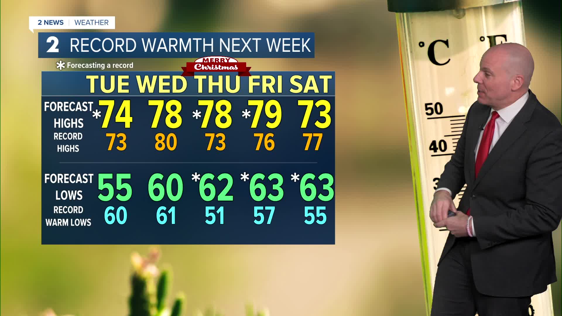 Much above normal temperatures likely next week with highs well into the 70s starting Tuesday. We will likely have a chance to break some record highs and perhaps some record warm low temperatures, including on Christmas Day. It won't feel very Christmas-like, but at least the weather will cooperate for holiday travelers.