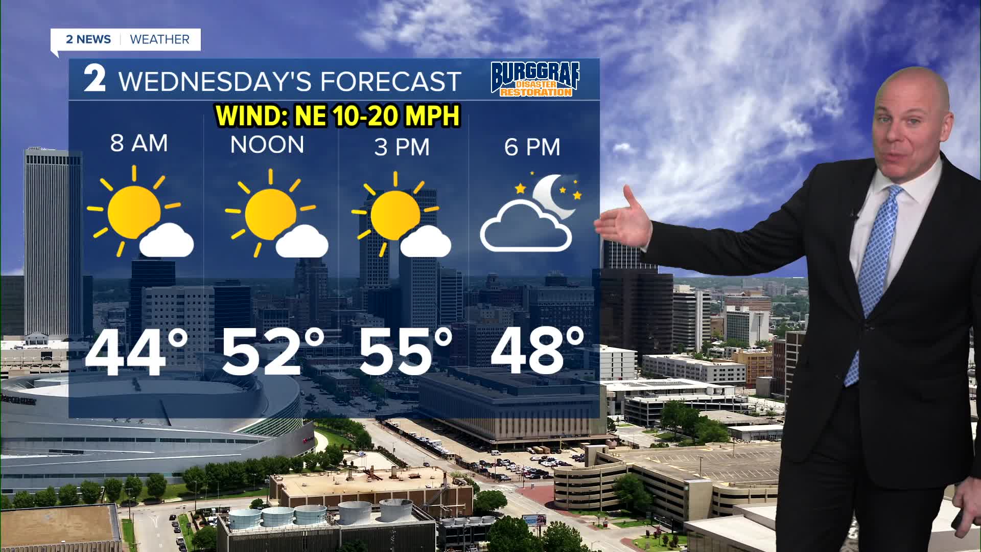 TULSA, Okla. — Some clouds will filter through tonight holding Wednesday morning temps in the low 40s. Afternoon highs will climb into the mid 50s with sunshine and north winds at 10-20 mph.