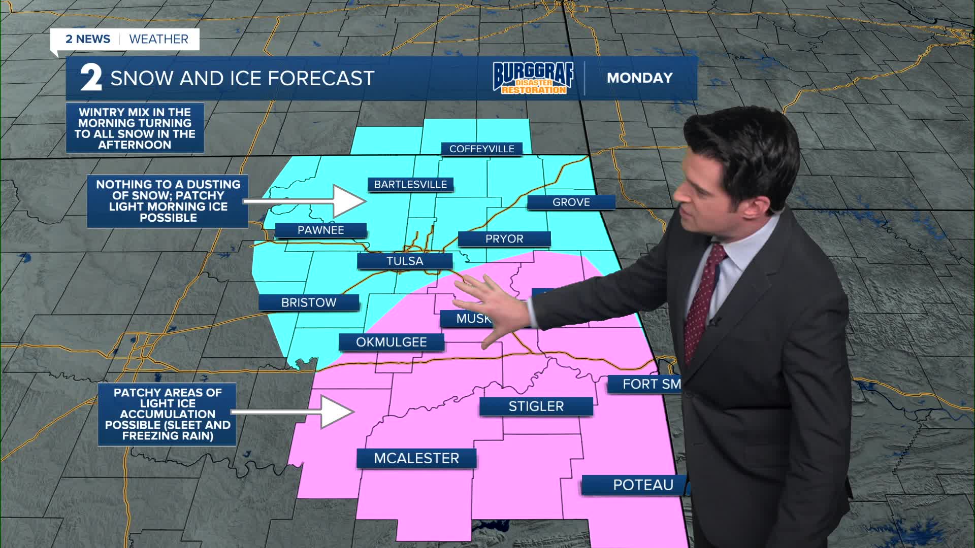 That light wintry mix looks to be around in the morning, then possibly changing to all snow in the afternoon from around Tulsa and up to the north and northeast. We could see up to a dusting of snow. The most should occur around the Oklahoma/Kansas line. The high in Tulsa reaching 35°. A variable wind direction 5-10 mph. Be extra cautious driving around if caught in the precip, especially any light icing.