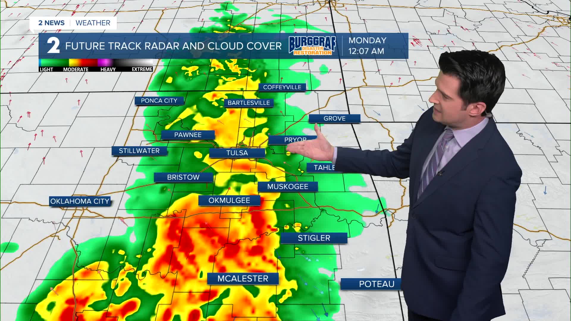 Cloudy skies on Monday with some scattered rain showers through the day. The high in Tulsa up to 58°, which is pretty much average for this time of year. South winds 10-15 mph.