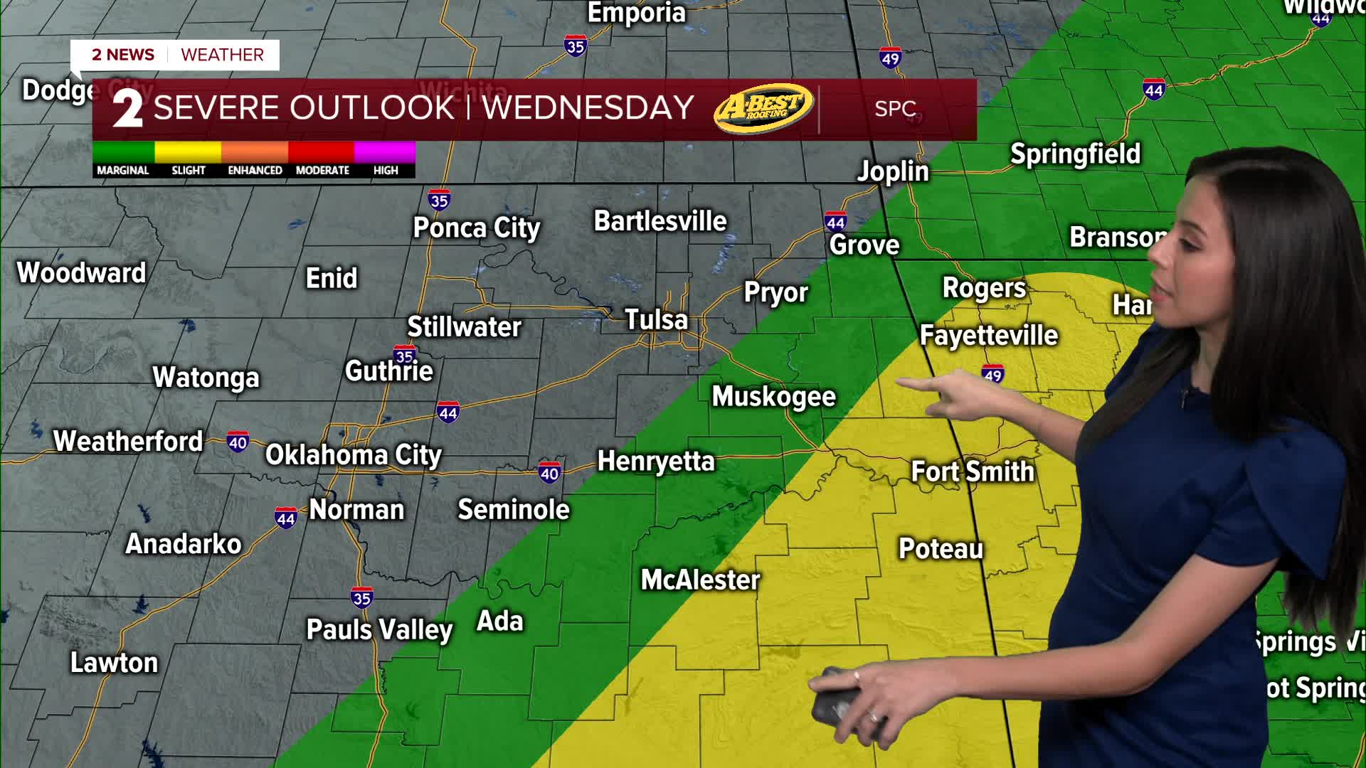 Mostly cloudy on Wednesday with some showers and t-storms in Green Country with a cold front in the area. Some of the storms could be strong to severe. Lows in the upper 50s with highs near 70°. North winds 5-15 mph.