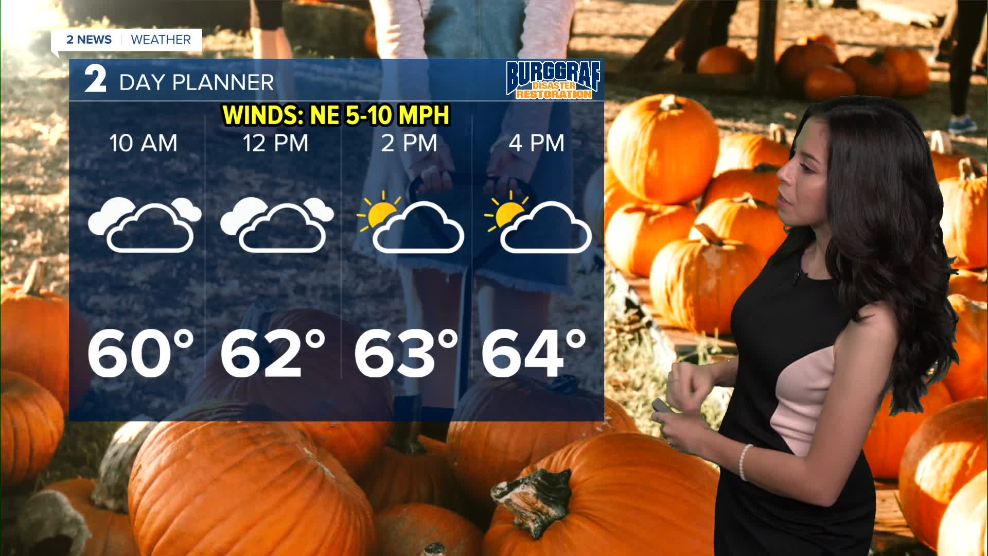 Halloween looks dry with morning temperatures in the low 40s. Afternoon highs in the low 60s with partly cloudy skies and calm west winds.