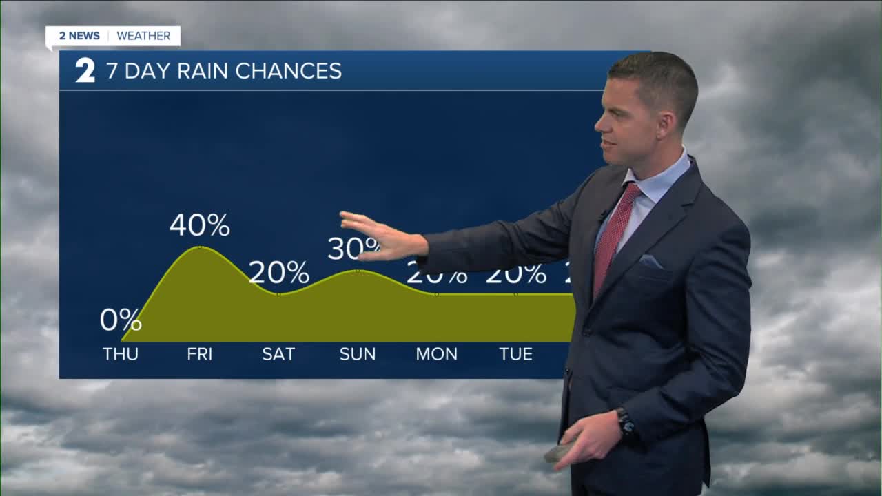 Temps will stay above average for your weekend plans with highs in the mid/upper 80s. Outdoor plans are a go with only a slight chance of storms.