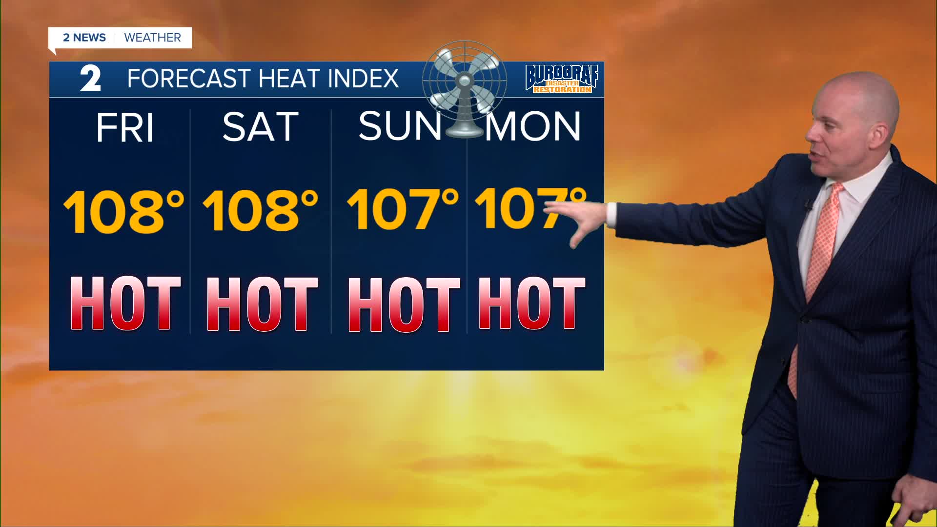 We'll finish the work week hot with highs in the mid to upper 90s. Factoring the humidity, heat index values over 105-degrees will be likely. While a stray pop-up shower or storm can not be ruled out, most of us will remain dry.