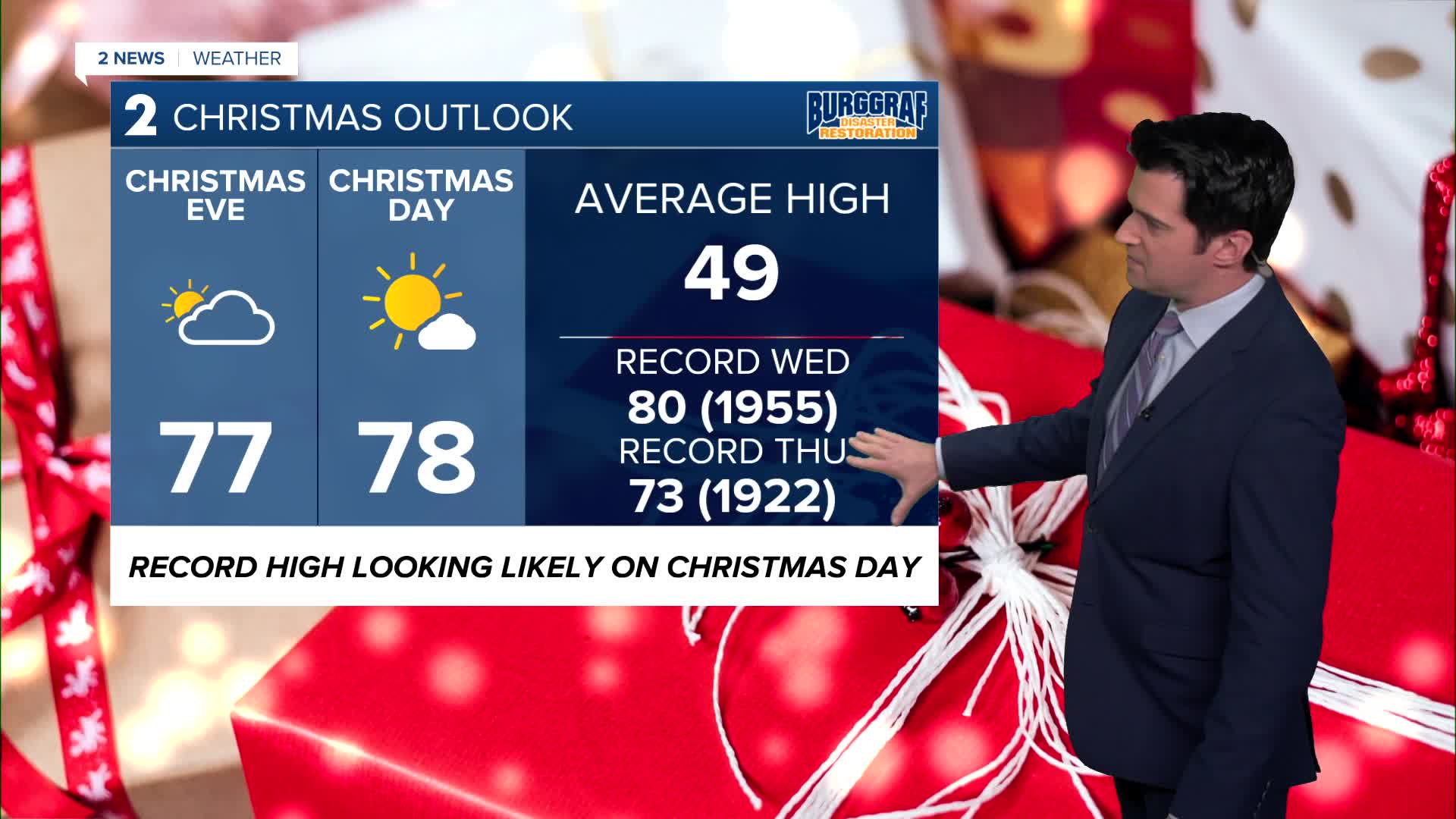 Then on Christmas Day, we could easily break the old record of 73° from 1922. Lows in the low 60s with the forecast high at 78°. Mostly sunny skies. Breezy SSW winds.