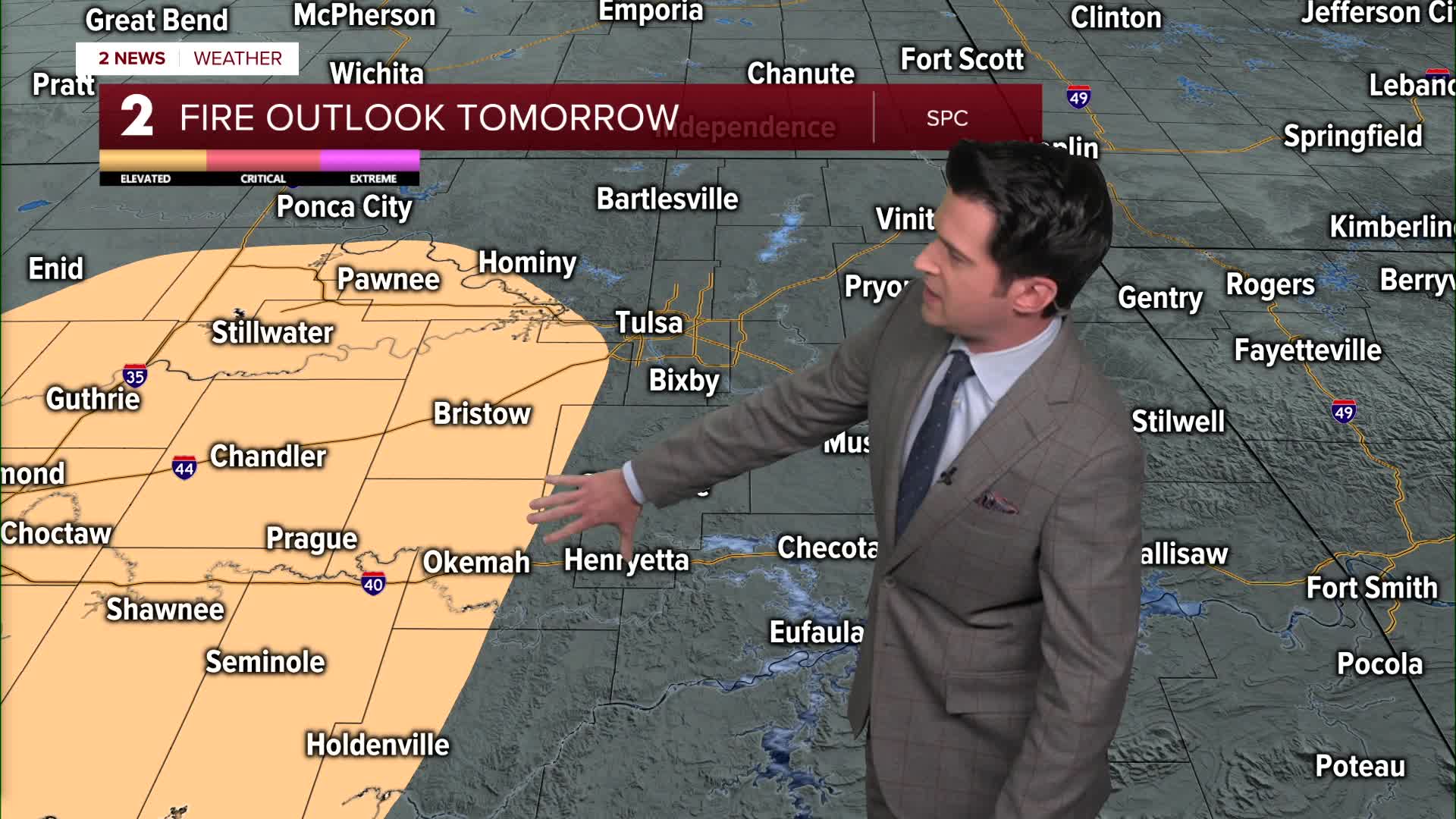 Mostly sunny skies on Sunday. Becoming quite gusty with south winds gusting up to around 30 mph. Increased fire danger, especially west of Tulsa. The high up to 91°.