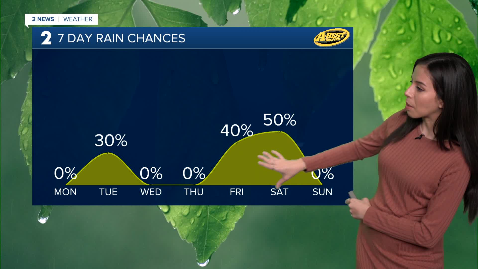 Rain chances increase Friday with highs in the low 60s. It looks like a wet end to the week and start of the weekend. Showers and storms appear to be more widespread on Saturday. We will continue to update those chances as we get closer.