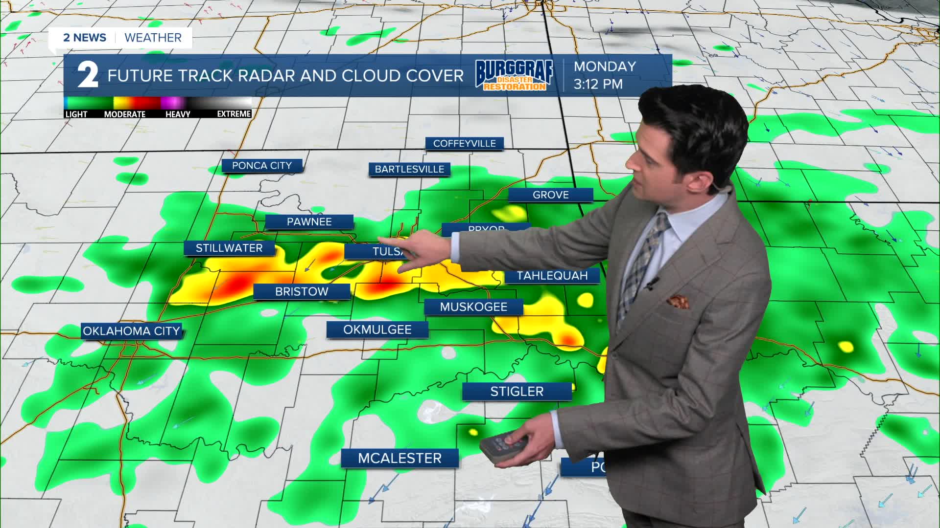 Chance for some more showers Tuesday morning, with most coverage south of Tulsa. Lows in the low 60s and then highs in the upper 70s. Mostly cloudy skies.