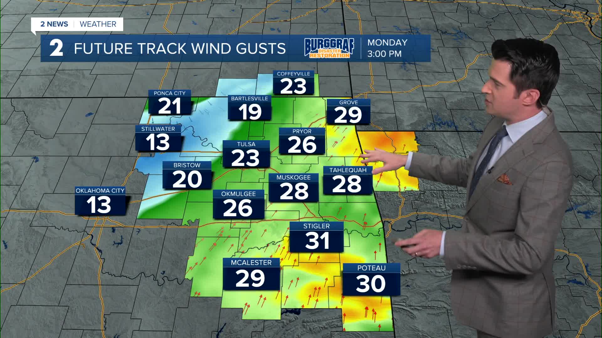 The wind gusts will peak during the morning to early afternoon Monday. South wind gusts 35-40 mph. The high reaching 85° in the Tulsa metro. Mostly sunny skies.