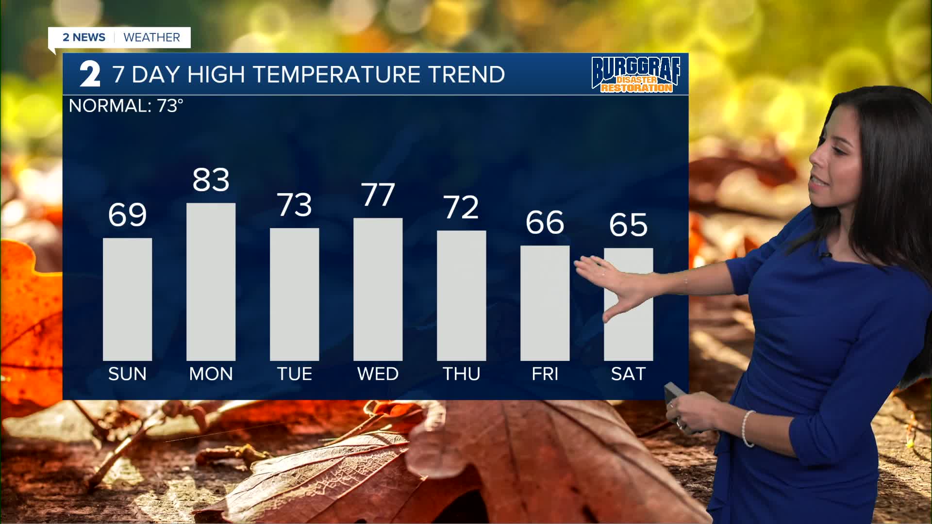Behind another cold front on Saturday, mostly cloudy skies. Lows in the the lower 50s and highs in the 60s. This looks to be the coldest air mass of the fall season so far. Stay tuned for the latest update.
