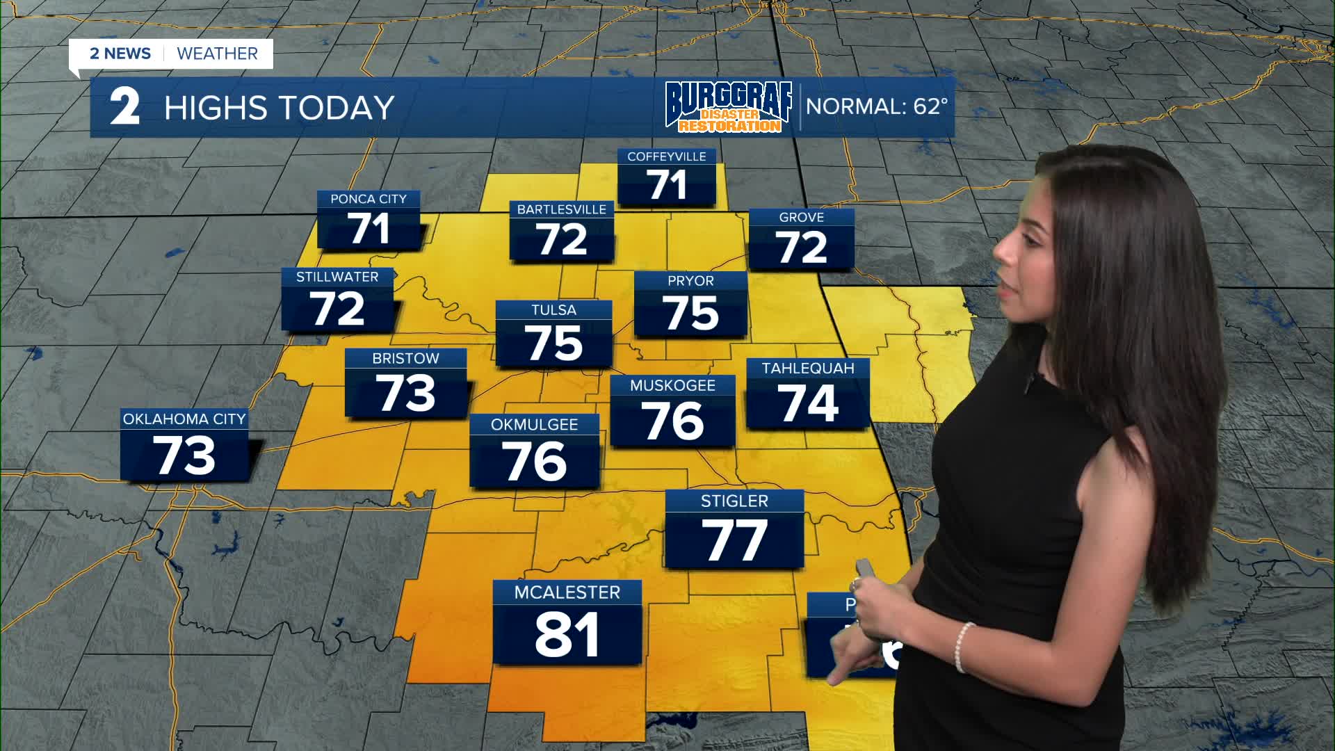 TULSA, Okla. — Pleasant Sunday for any outdoor activities. Highs this afternoon in the mid 70s with partly cloudy skies and calm easterly winds.