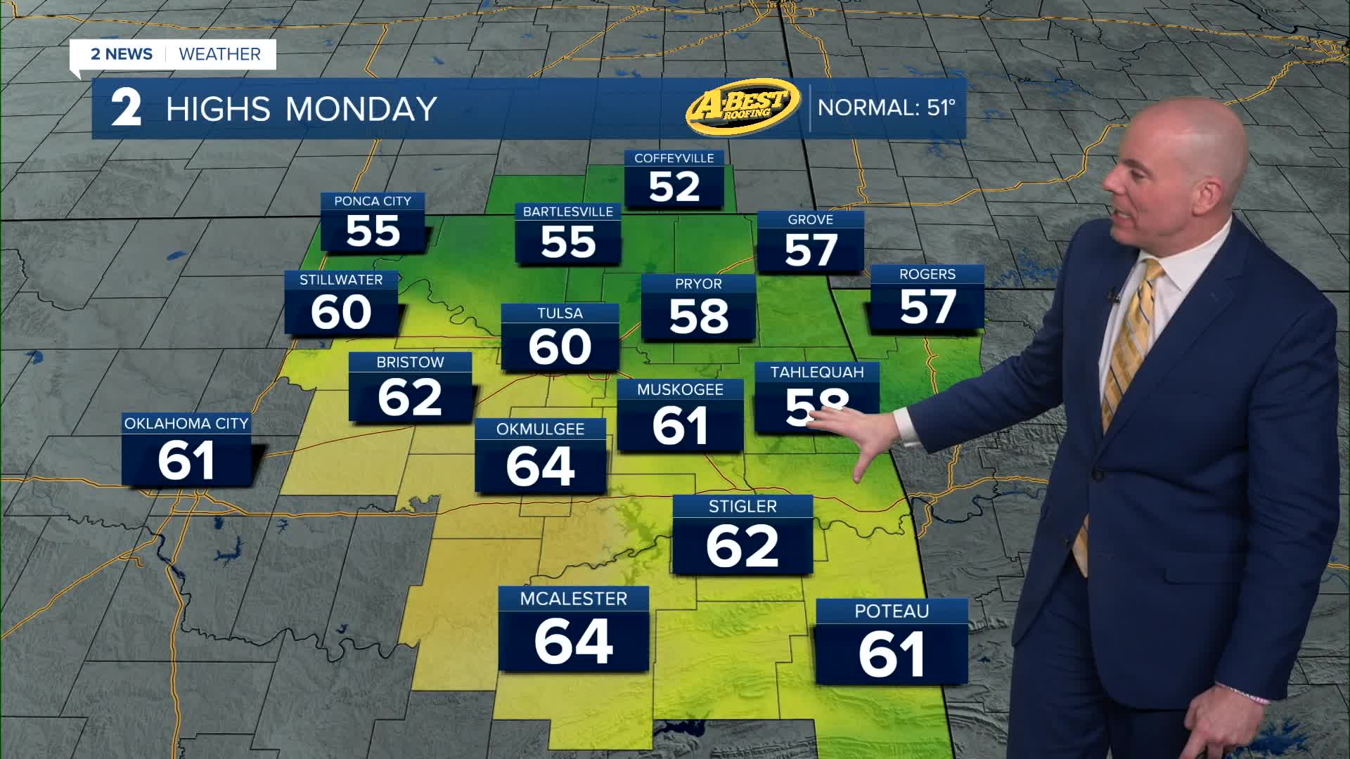 TULSA, Okla. — A few high level clouds may filter through overnight as temperatures will fall into the mid/upper 20s by daybreak Monday. Monday afternoon is looking fantastic. Temperatures will range from mid 50s northeast to low to mid 60s southwest. Currently forecasting a high near 60°F for Tulsa. We'll enjoy some sunshine, perhaps filtered sun with more high level clouds moving in during the afternoon. Great day to be outside or head to the car wash!