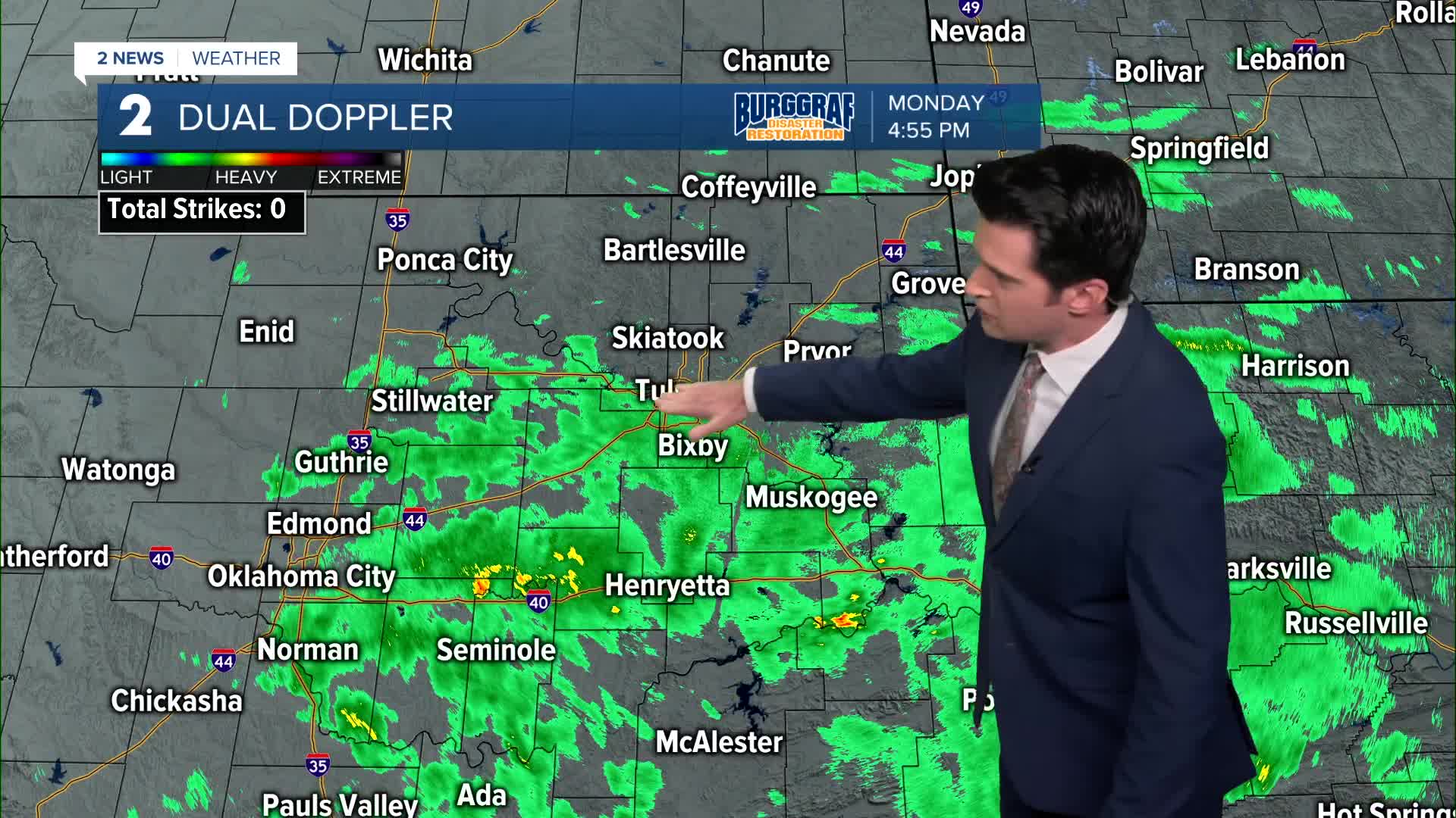Chance for rain showers Tuesday morning around Tulsa and off to the south. The high reaching 79° in Tulsa. East winds 5-15 mph.