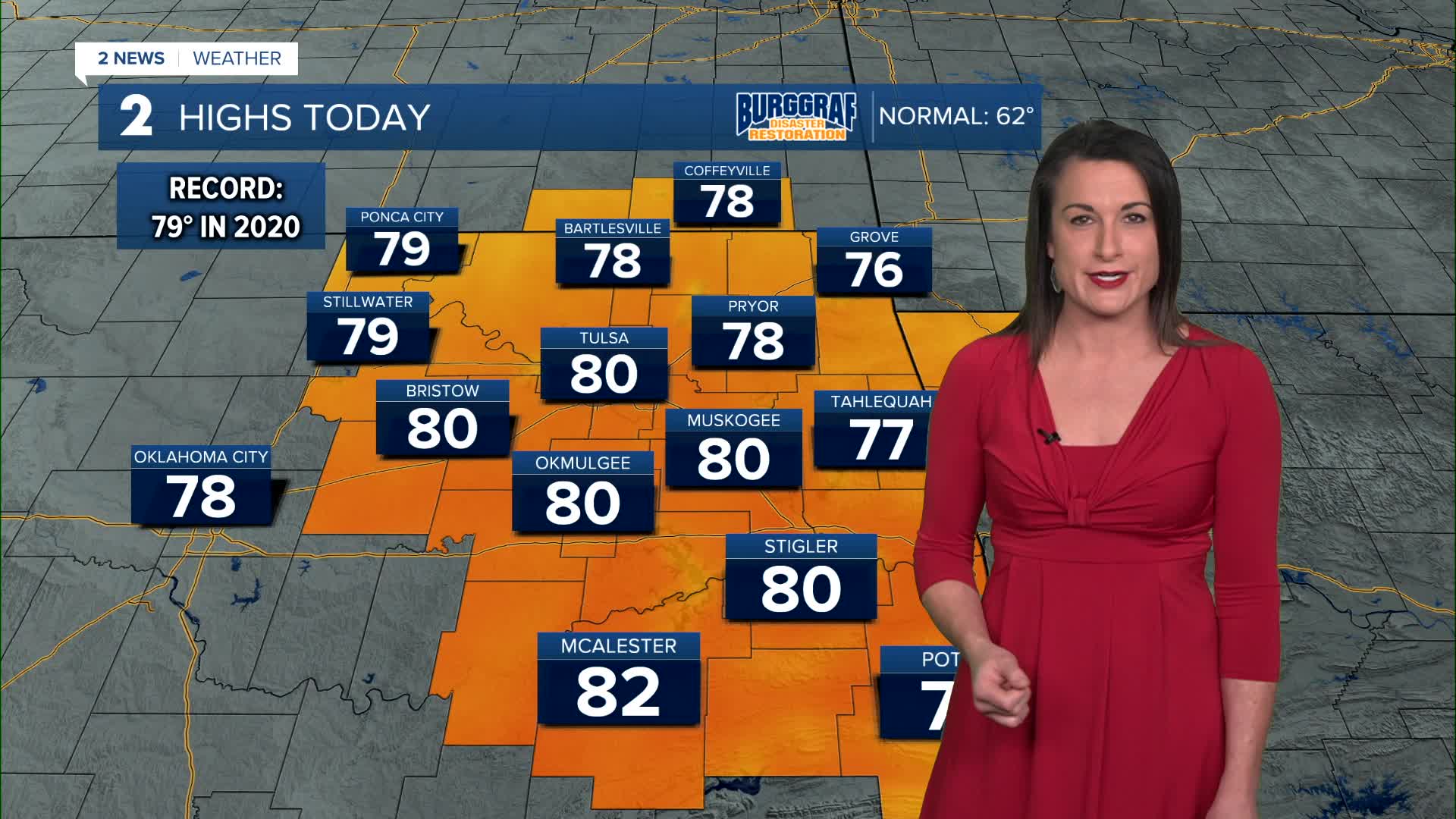 TULSA, OKLA — Becoming very warm and windy today with record to near record highs this afternoon around 80 degrees. The record for the day is 79° from 2020.
