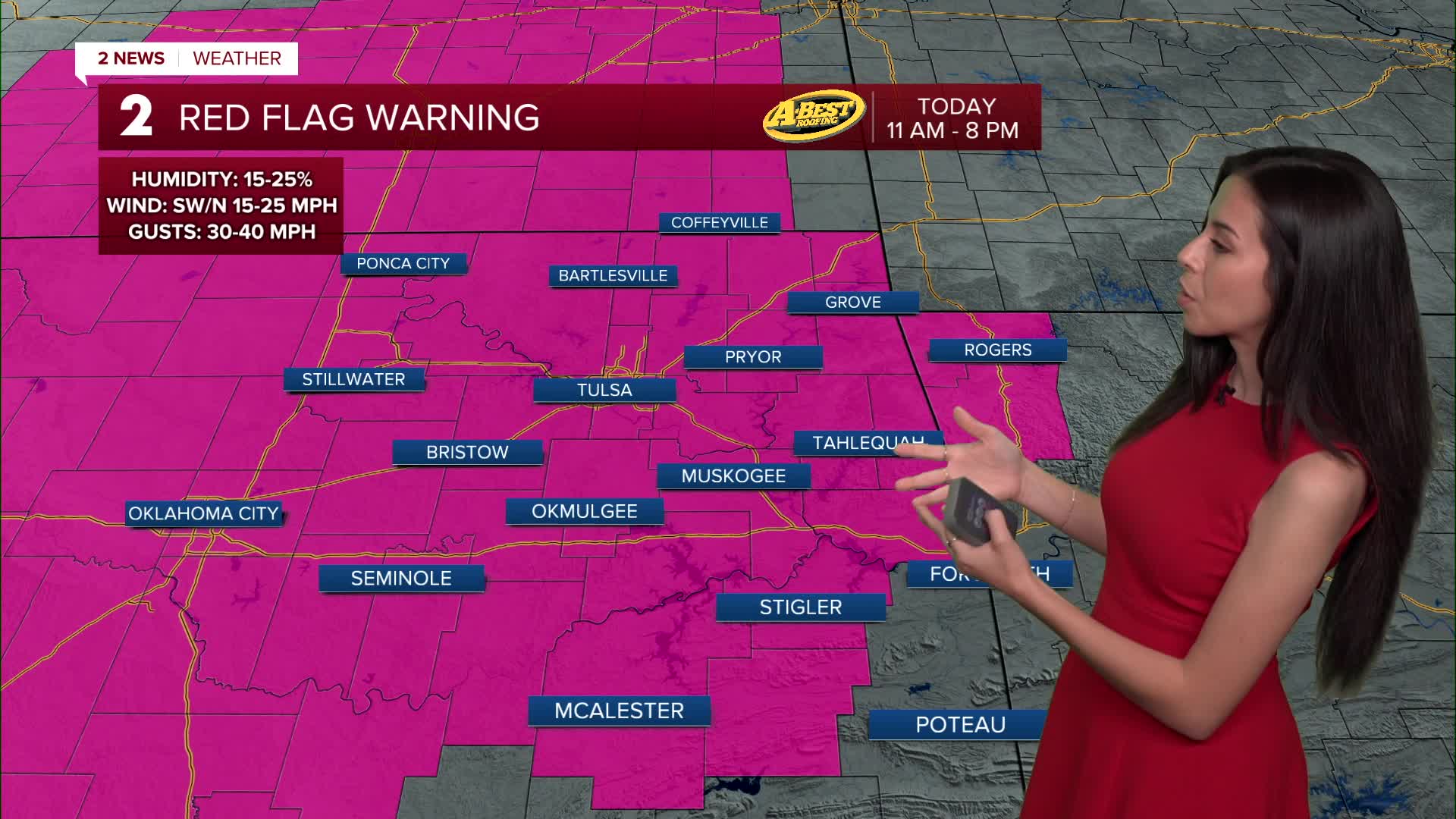 On Thursday, morning lows in the upper 60s with south winds 15-25 mph. We could be close or tie the record of 94° from 2020. We are forecasting 94° in Tulsa. Mainly sunny skies.