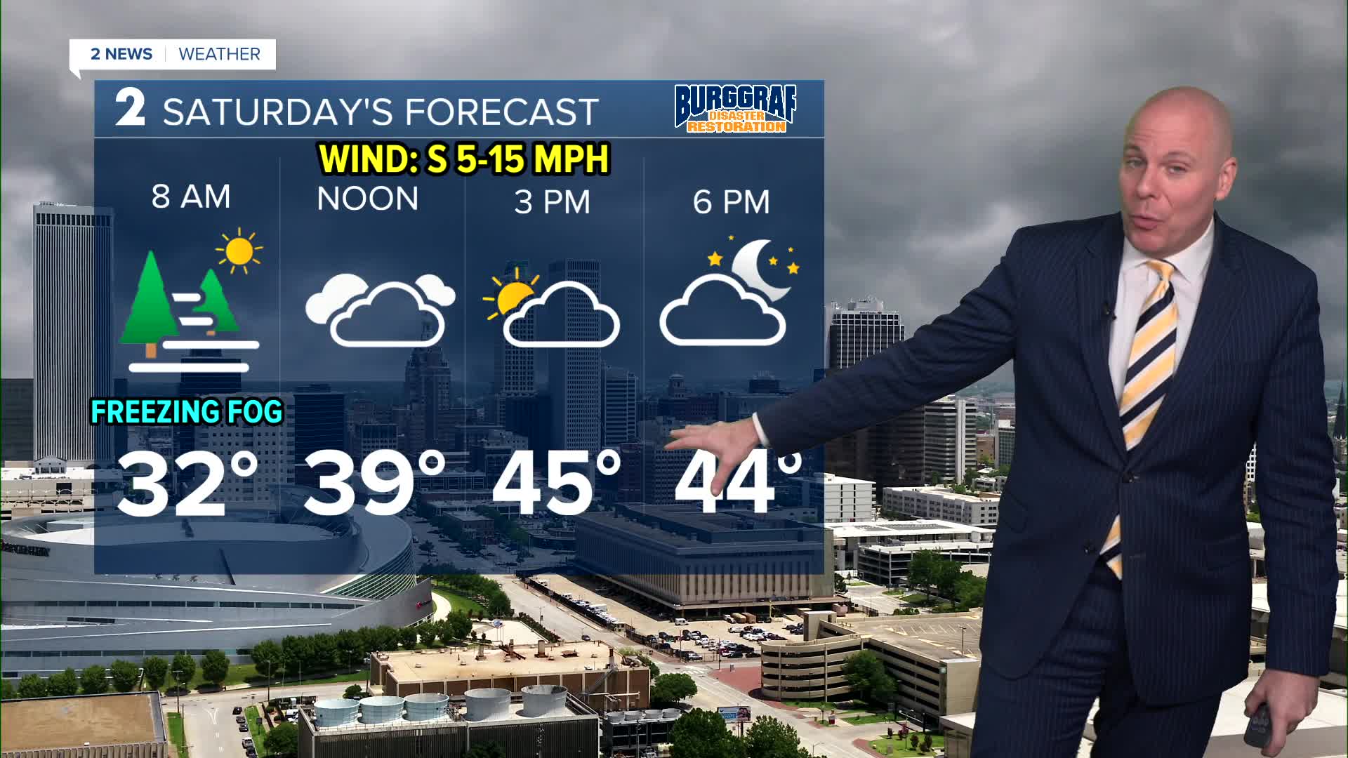 TULSA, OKLA — Saturday morning will be similar to what we saw Friday morning with fog developing overnight. Where temps drop to freezing, freezing fog will be possible which could lead to a few slick spots on bridges and overpasses. Visibility could drop below 1/4 mile in some spots as well.