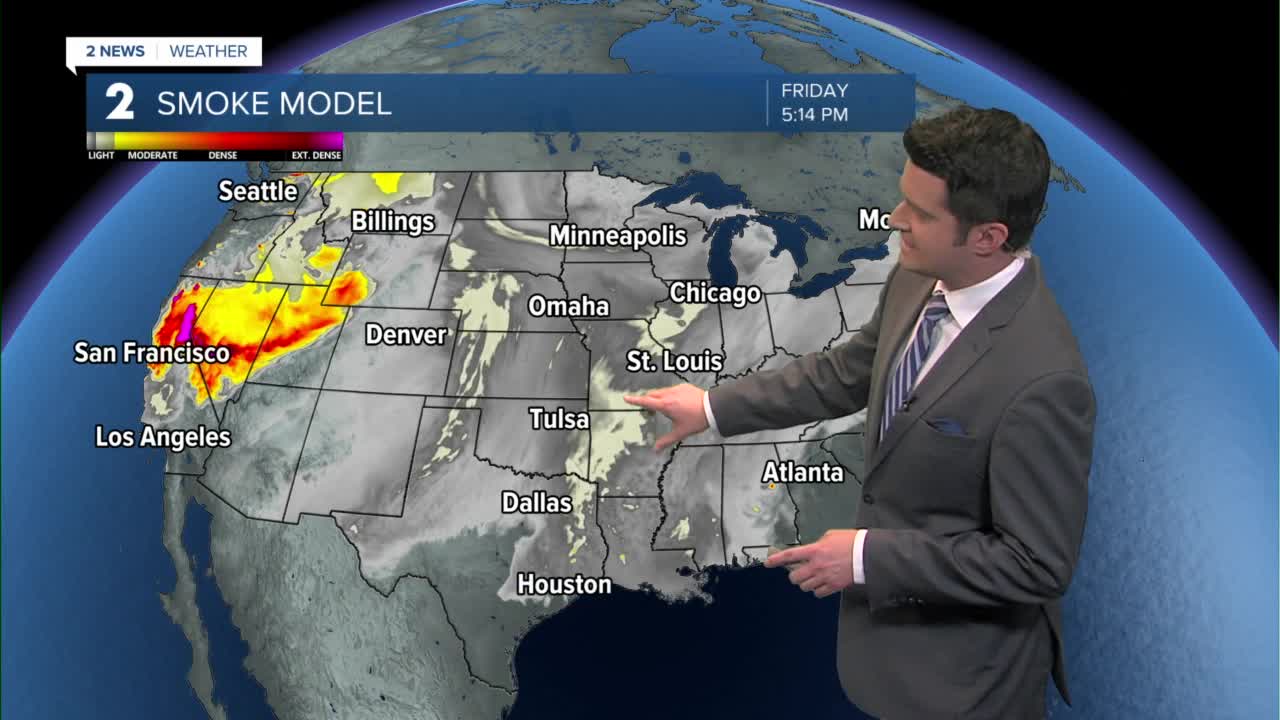 TULSA, Okla. — The fog and low clouds will dissipate this morning leaving us with a mostly sunny sky. The smoke lingers. The high in Tulsa reaching 94°. The max heat index at 99°. South winds 10-15 mph.