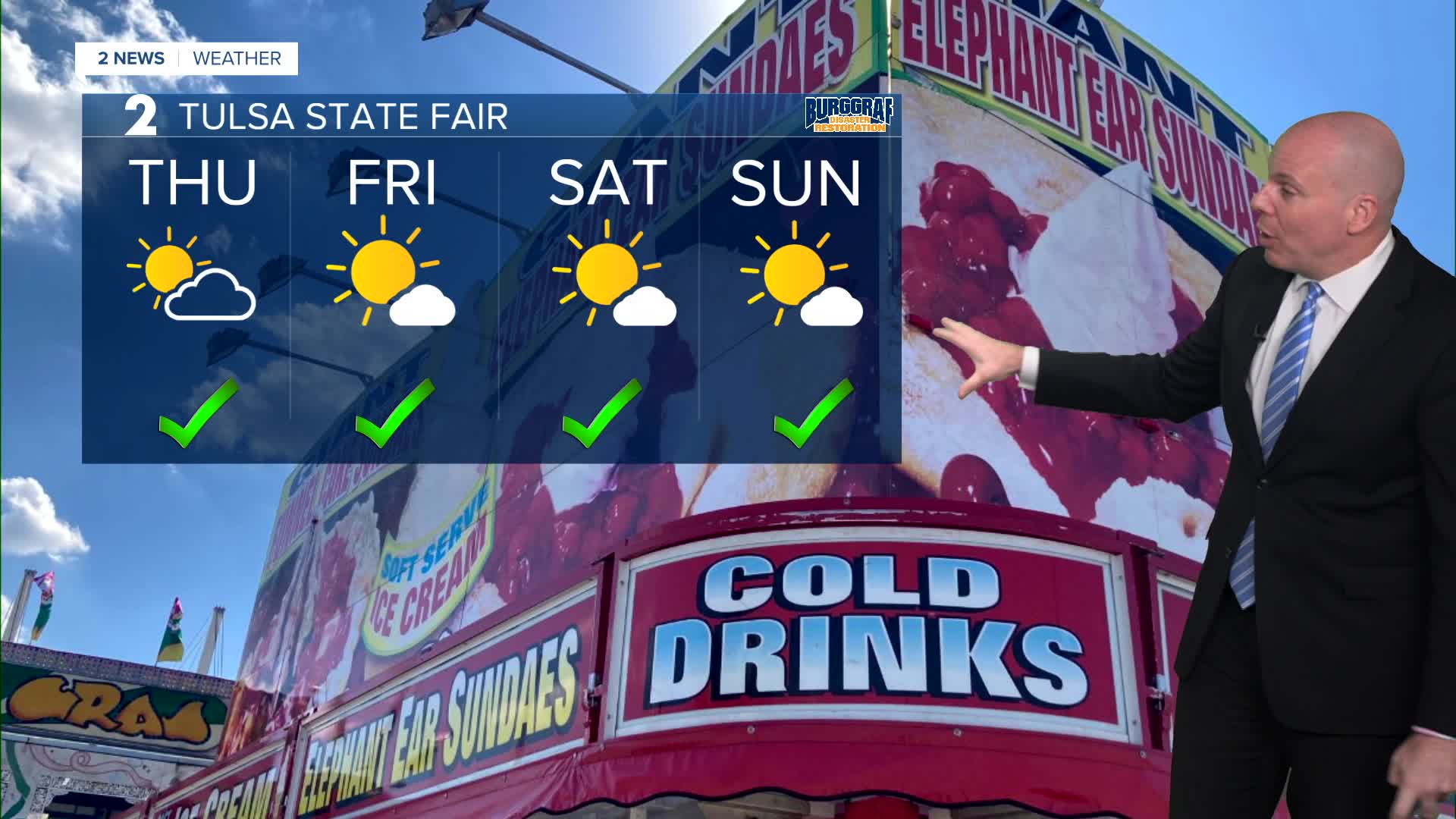 Dry conditions continue Friday through the weekend with mostly sunny skies. Lows from the upper 50s to the low 60s and highs in the low to the mid-80s. Perfect weather if your weekend plans take you to the Tulsa State Fair!