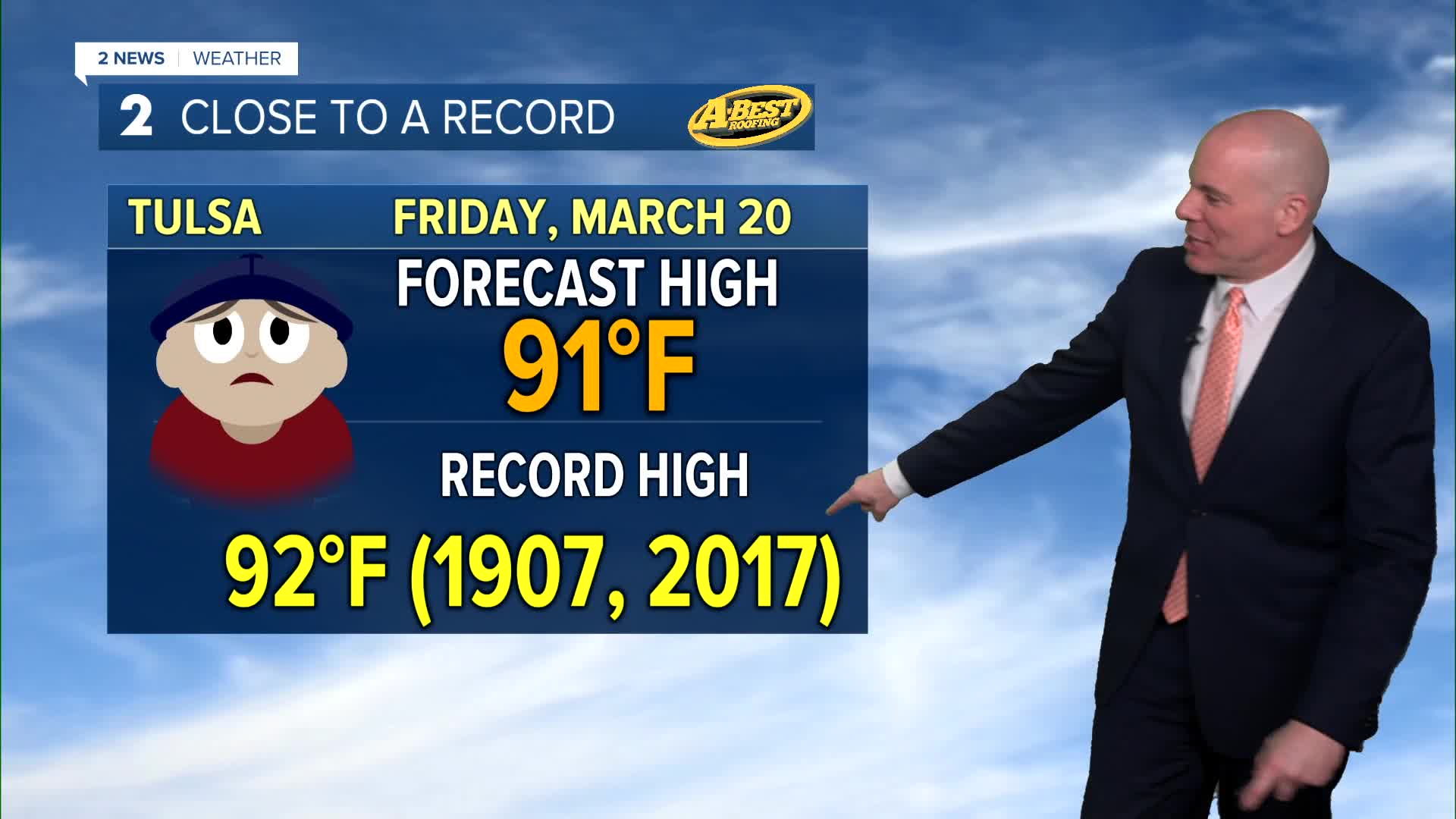 TULSA, OKLA — The heat will continue to build Friday and Saturday, when many communities across eastern Oklahoma can expect highs in the upper 80s to lower 90s. A few daily temperature records could be tied or even broken during this time.