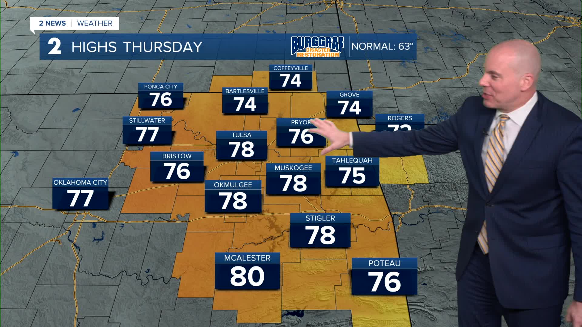 TULSA, OKLA. — Lows down to the mid 40s Thursday morning and then highs in the upper 70s with a light south wind. Beautiful day for outdoor plans!
