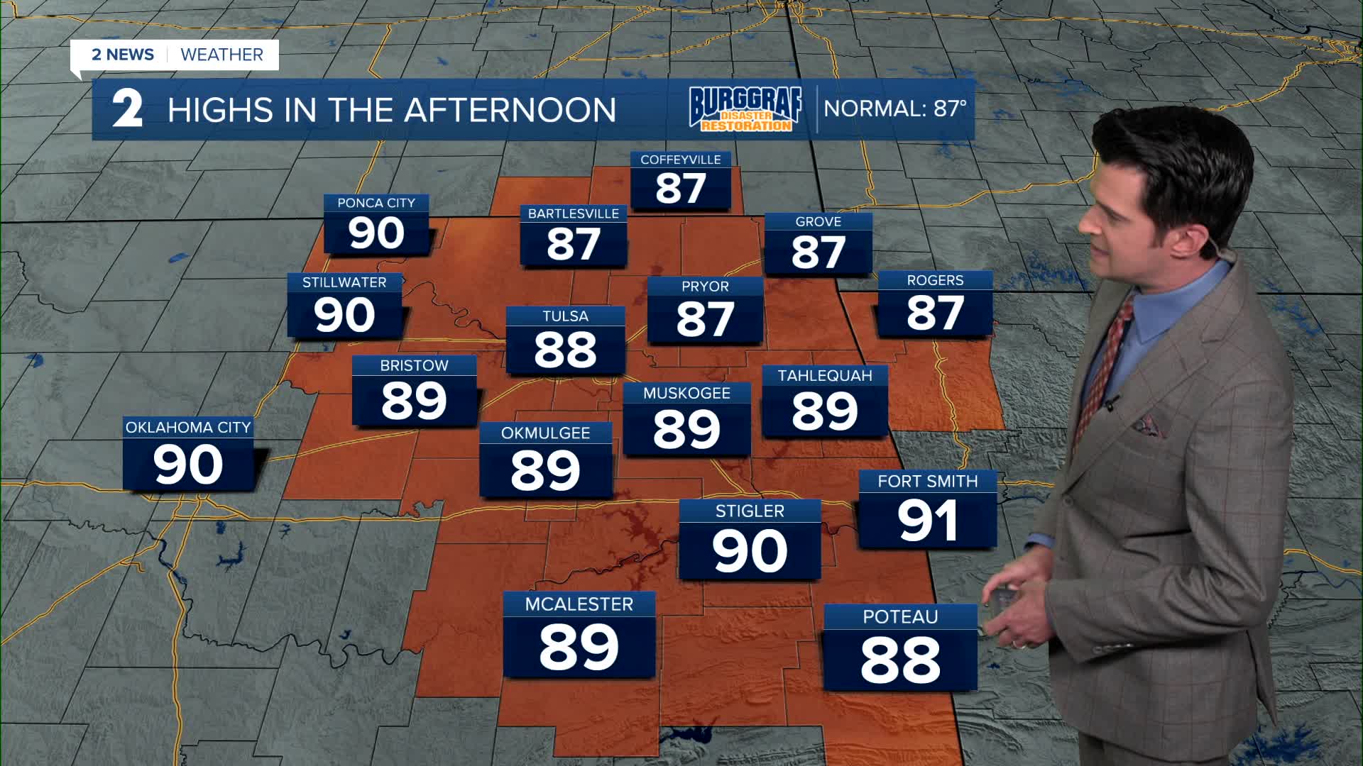 TULSA, Okla. — We'll have mostly clear skies tonight with the low in Tulsa down to 63°. South winds 5-10 mph.