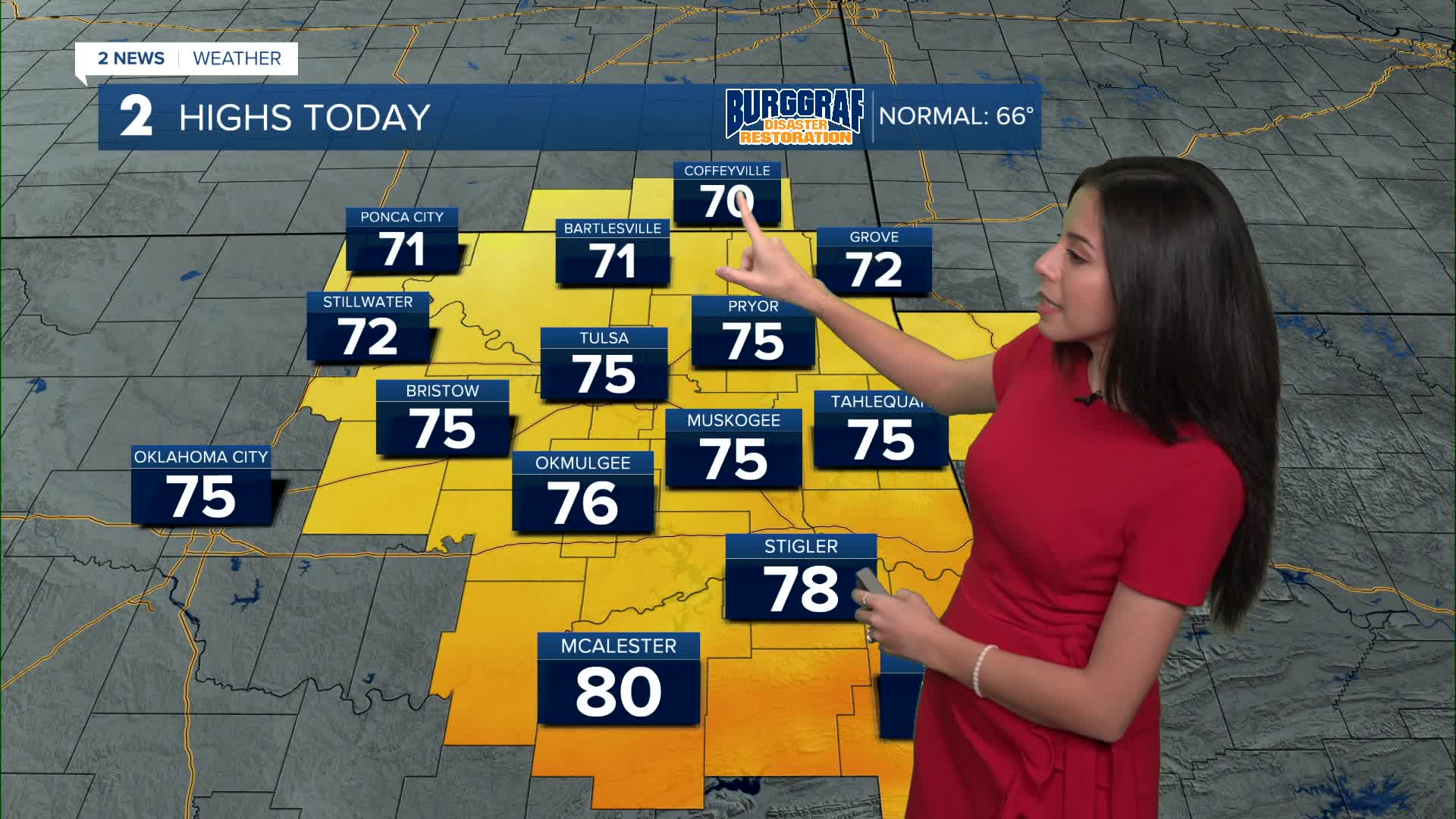 TULSA, Okla. — Another pleasant day for any outdoor activities. A weak cold front moves across the area but won't drop our temperatures too much. Look for mostly sunny skies with northeast winds 5-15 mph and highs in the mid 70s.