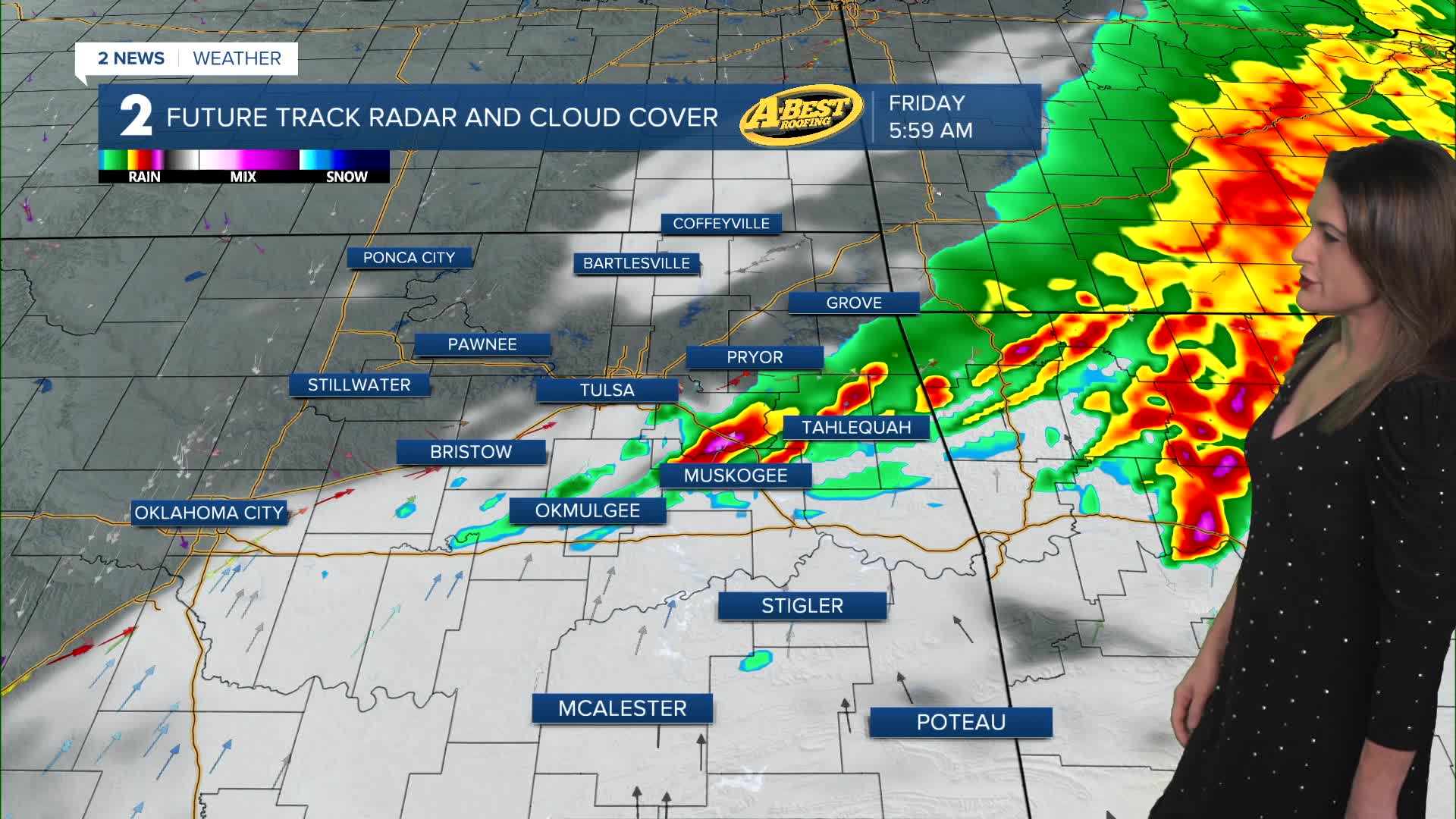 Storms may linger Friday morning, mainly east of Tulsa. During the afternoon and evening, as a stalled front near I-40 could trigger another round of thunderstorms.