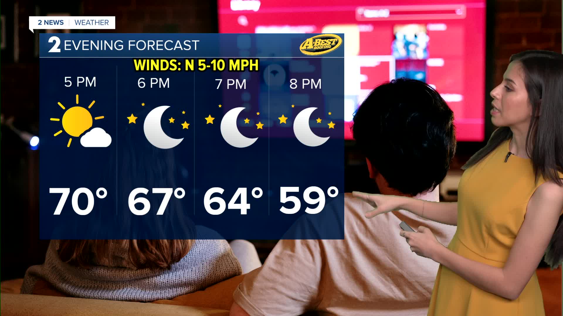 Overnight lows in the low 40s with lots of sunshine for Monday. Afternoon highs climb well above average near 77° with calm south winds. Perfect weather for any outdoor plans.