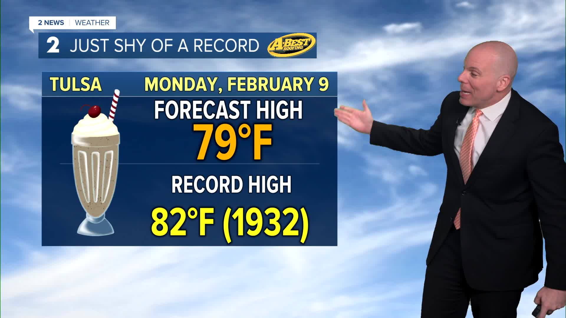 TULSA, Okla. — Overnight lows will fall into the upper 30s and low 40s with a clear sky. A jacket to start Monday morning, but then look for a quick warm up! Lots of sunshine with a light south breeze will push afternoon highs into the upper 70s and perhaps the low 80s! Tulsa's February 9th record high of 82F (1932) looks safe, but we may at least get close. Perfect weather for any outdoor plans.