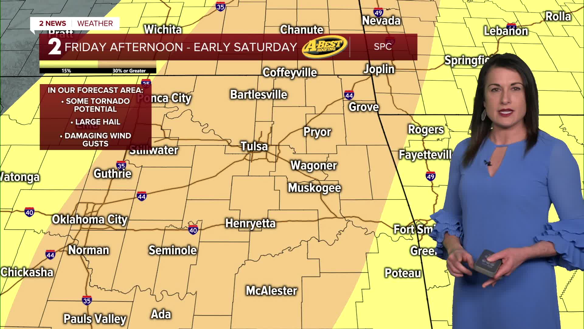 The most active day of the week. Widespread showers and thunderstorms are expected as the front stalls across southeast Oklahoma and northwest Arkansas.
