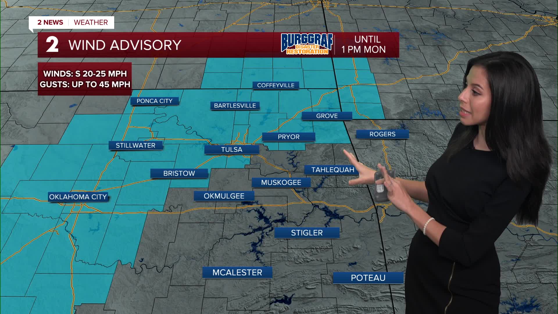 A warm Monday ahead with highs in the mid 80s this afternoon. Sunny skies with south winds gusting up to 45 mph for some. Limited fire weather for some as well. A cold front will move in through the evening which will drop temperatures for Tuesday.