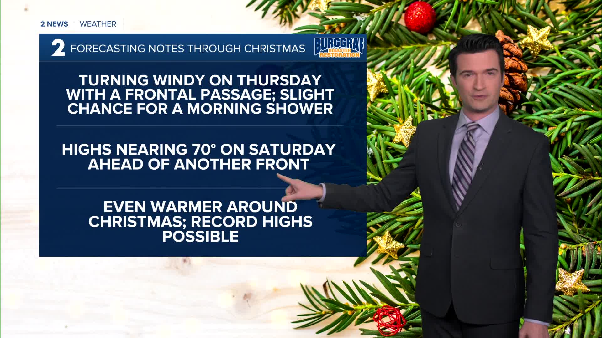 An early look around Christmas Eve and Christmas Day suggests highs in the 70s. We could be near record highs especially on Christmas Day. Stay tuned.