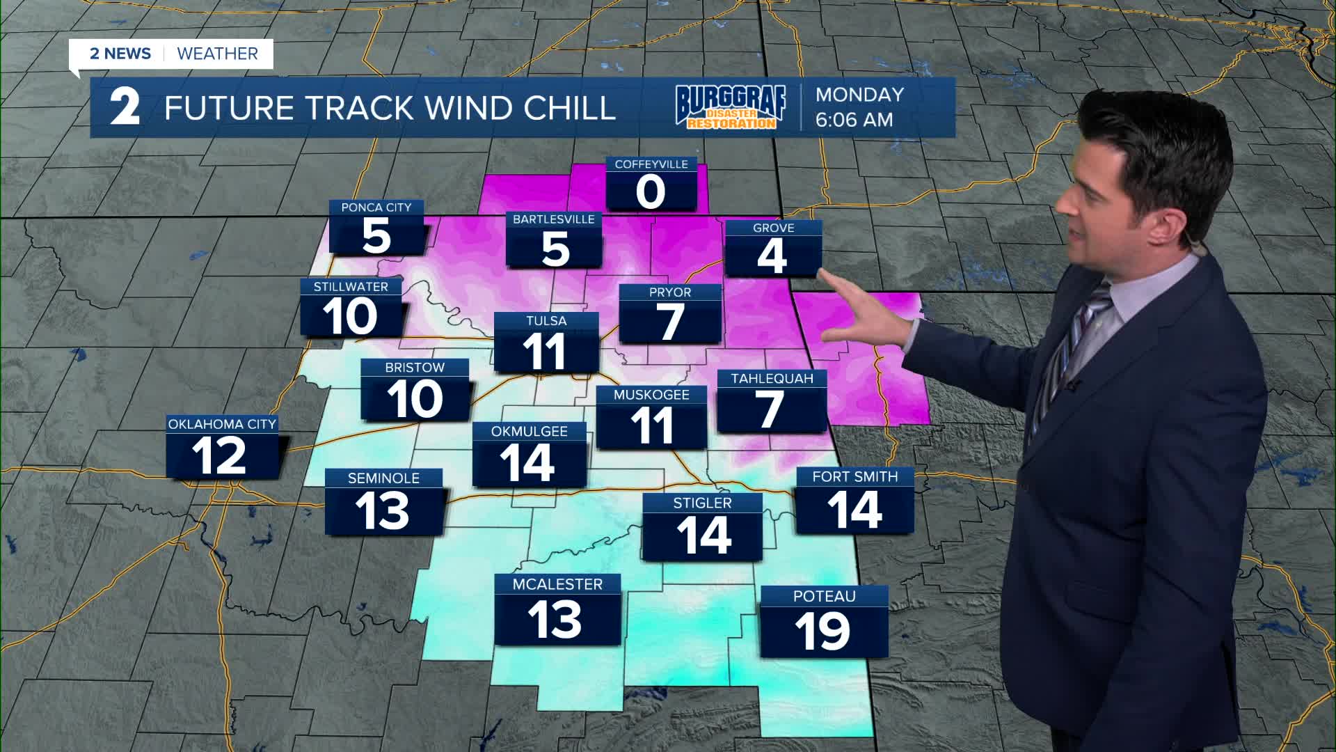 TULSA, Okla. — We'll see clearing skies tonight with NW winds 15-25 mph. Some gusts up to 30-35 mph. The low in Tulsa down to 22°, but wind chills area-wide in the single digits and teens tonight through Monday morning.